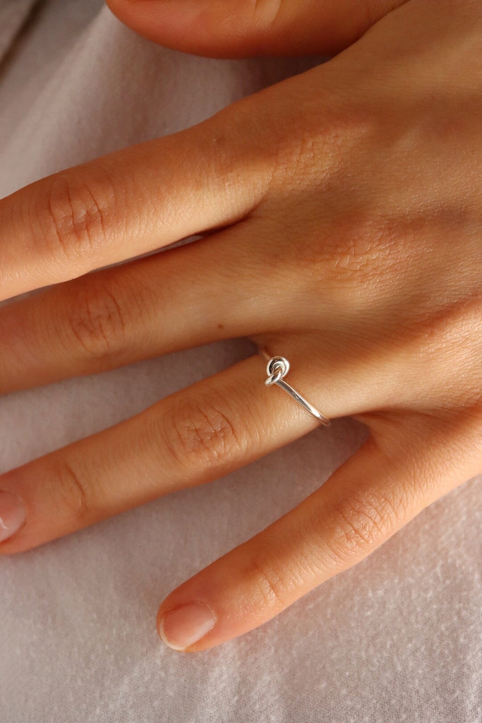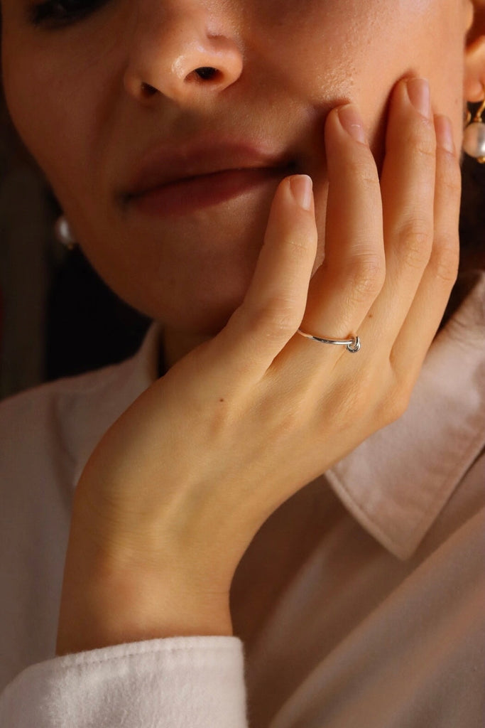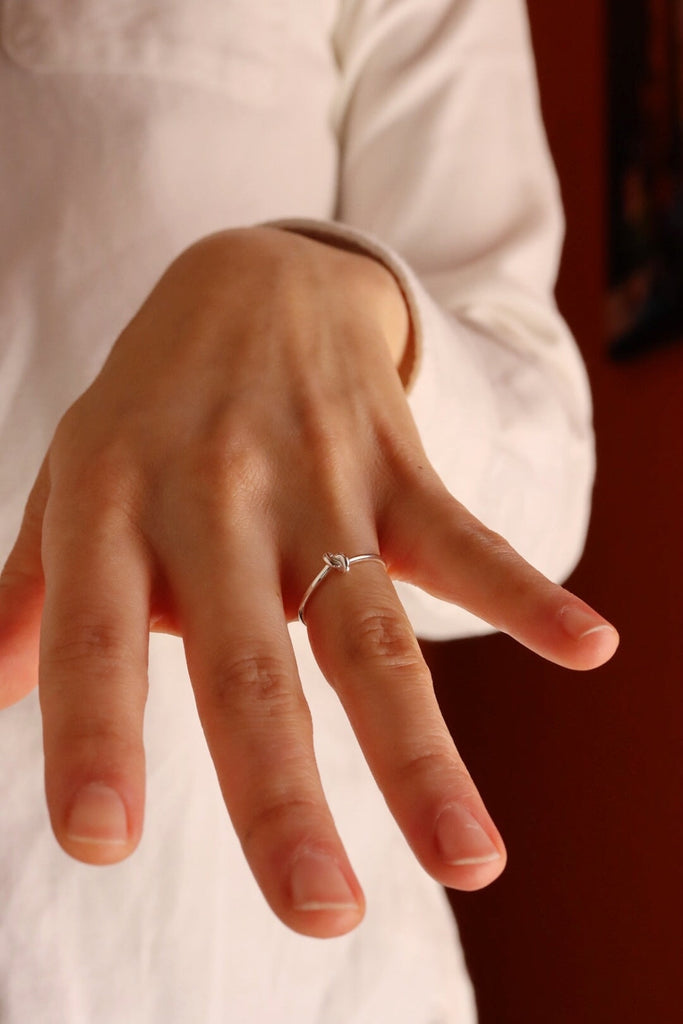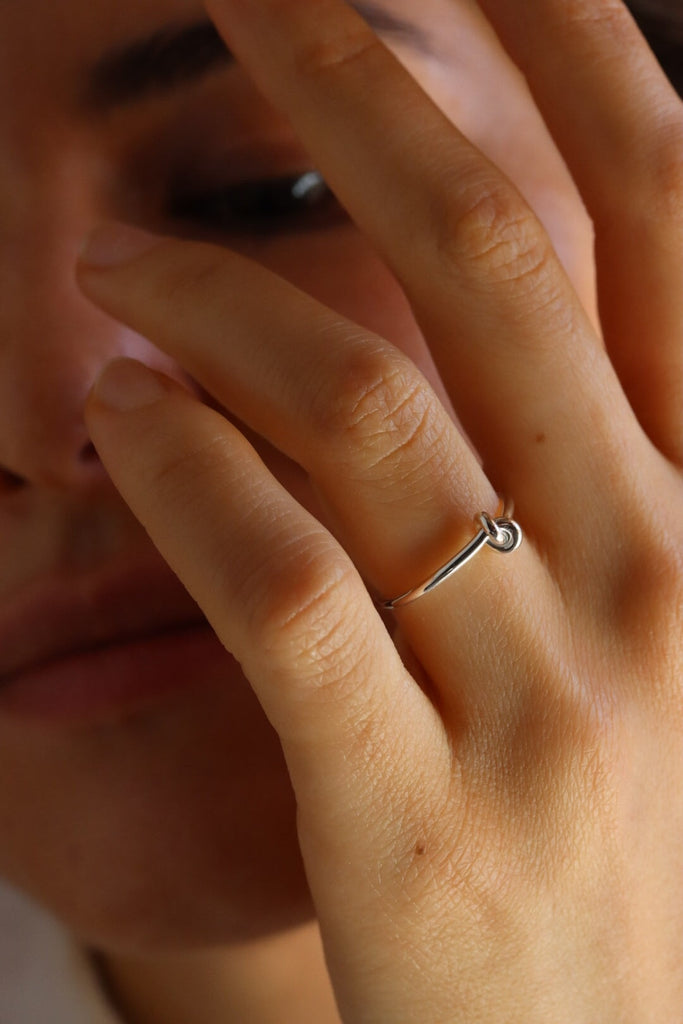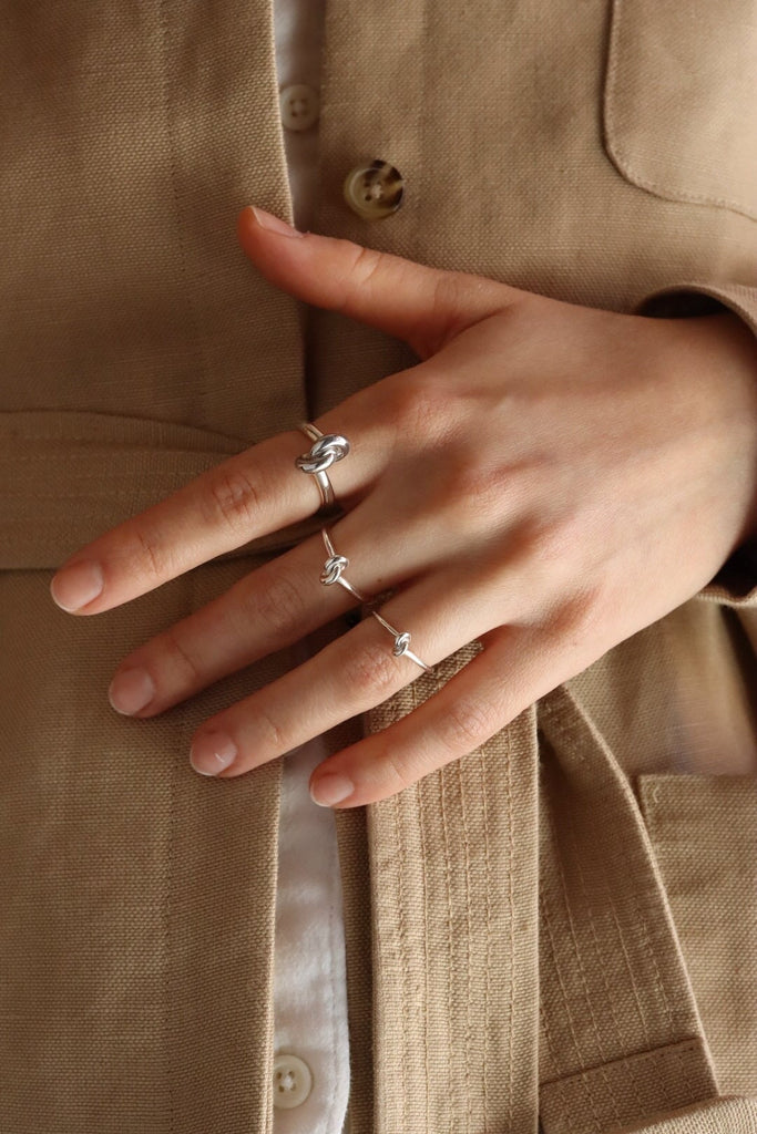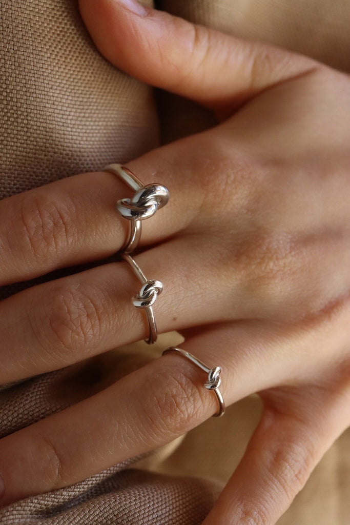 Ogni anello nasce da un filo di argento di 1,5 mm veramente annodato - così! - fino a ottenere un nodo stretto stretto stretto e unico.