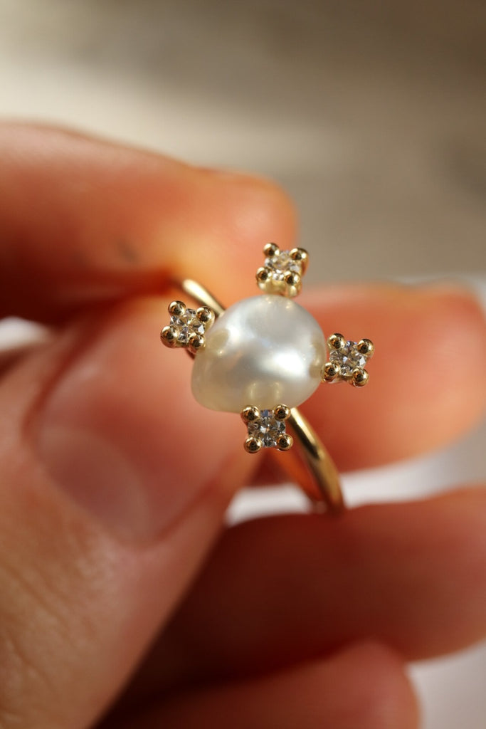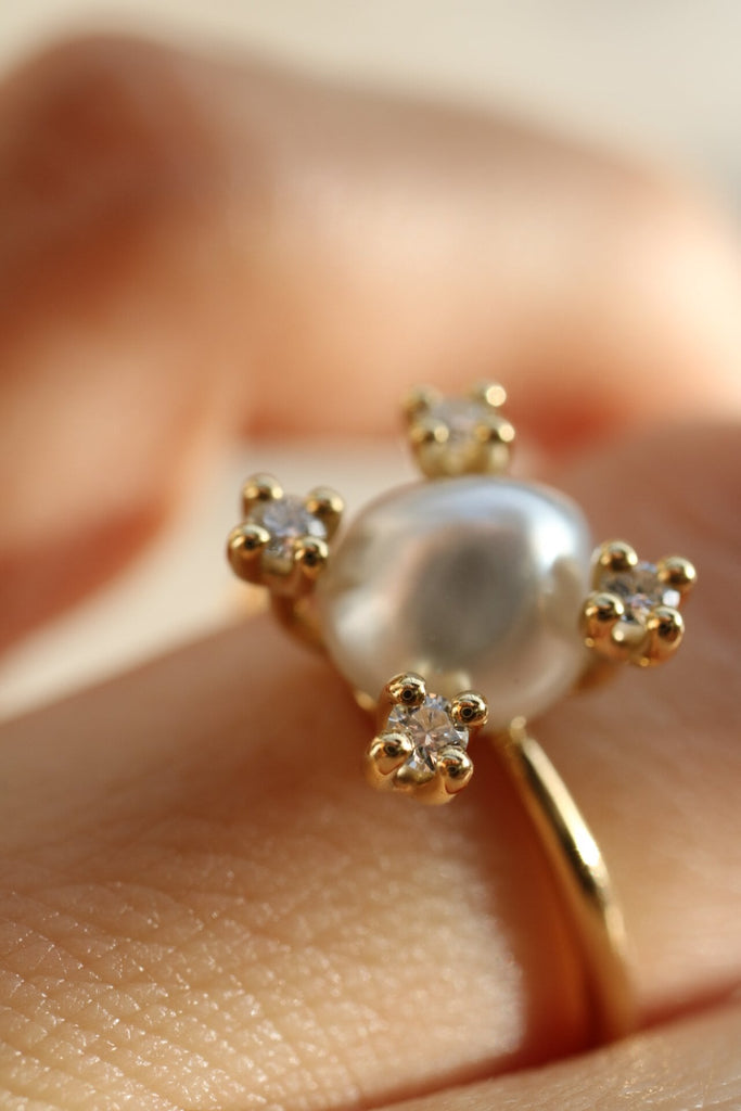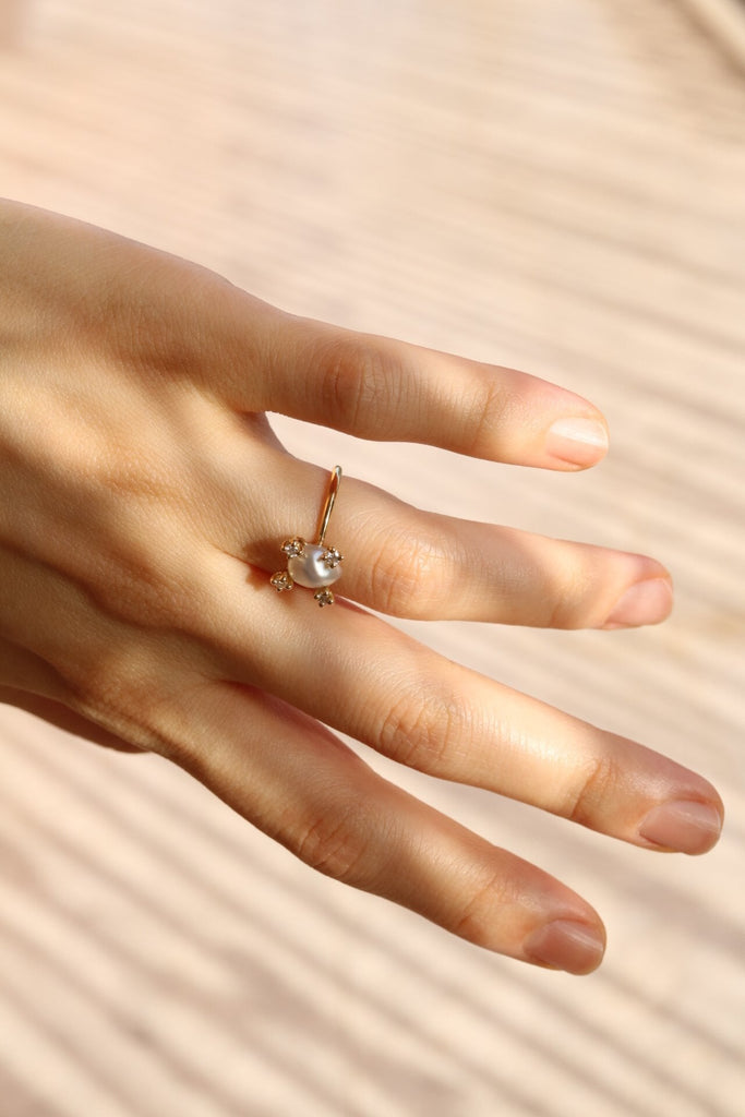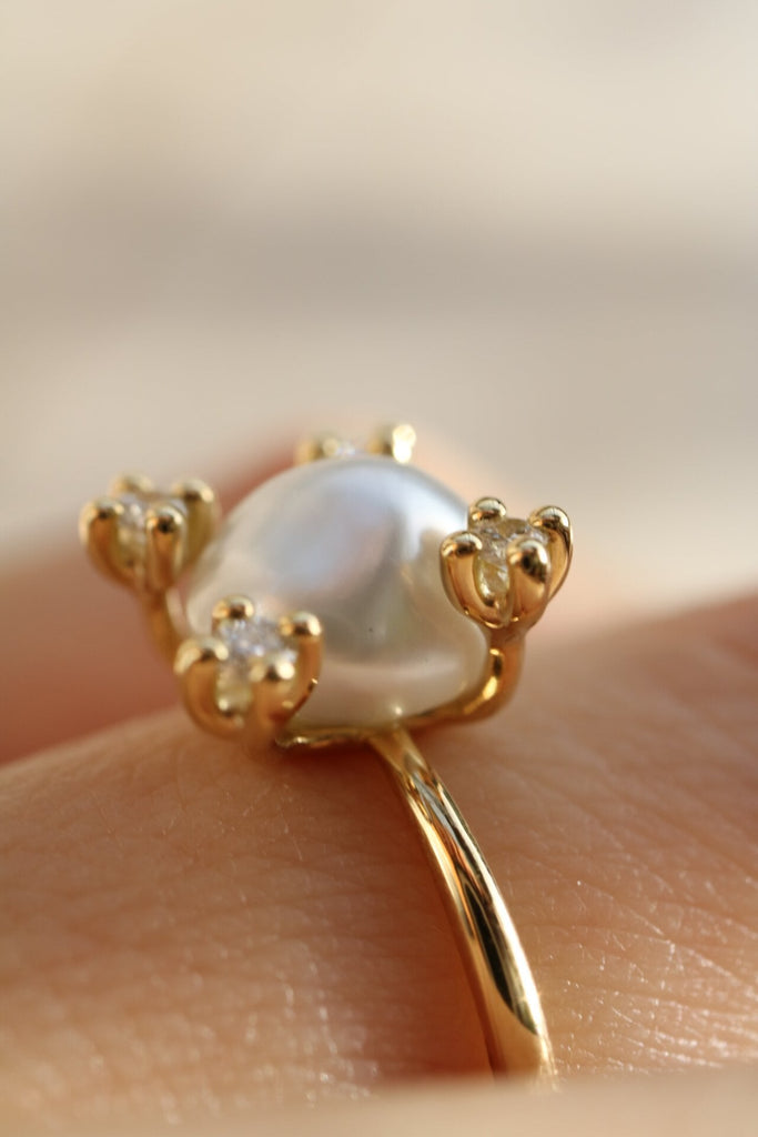 Oro certificato Fairtrade 18k di colore giallo vivo, quattro diamanti Canadamark melee da 2 mm e una perla keshi di Tahiti da coltura sostenibile di circa 7 mm.