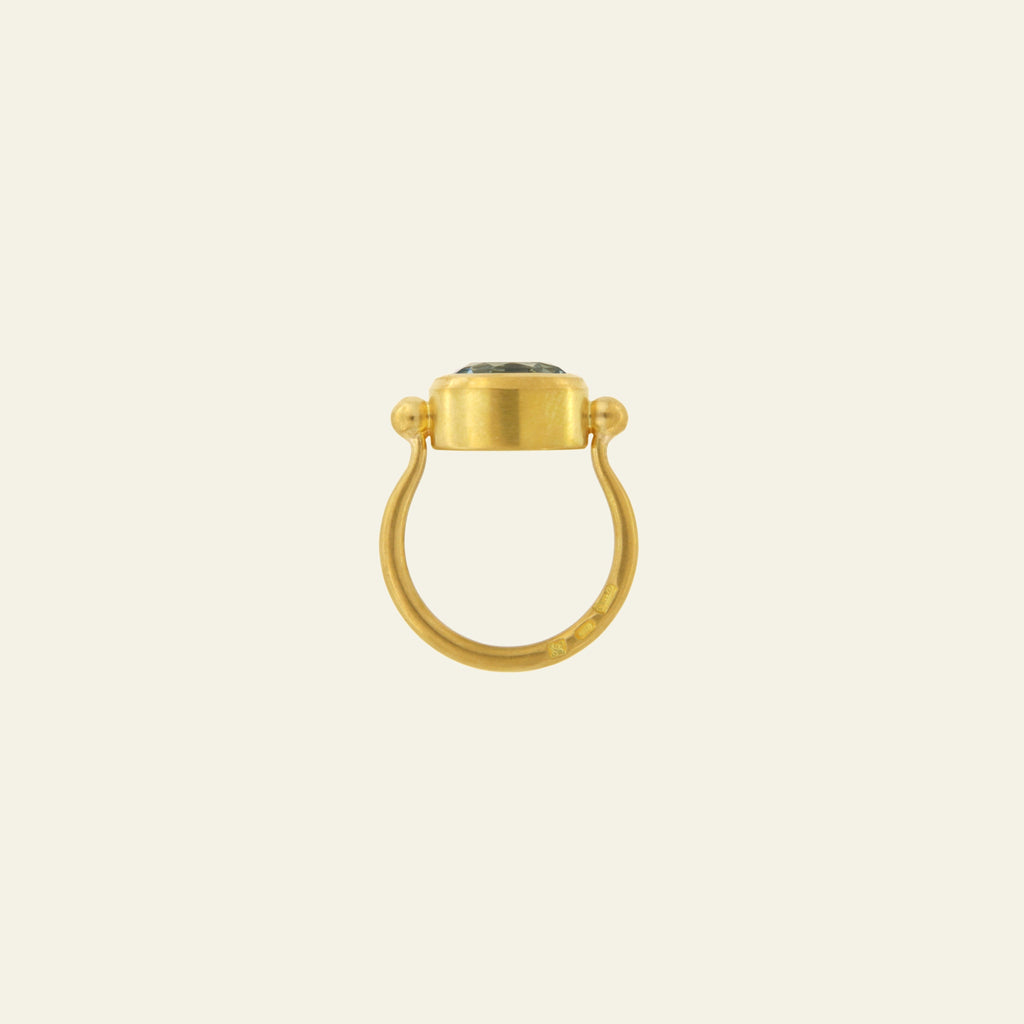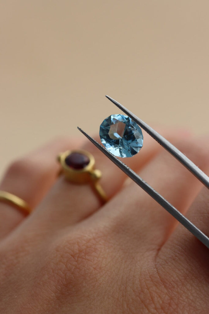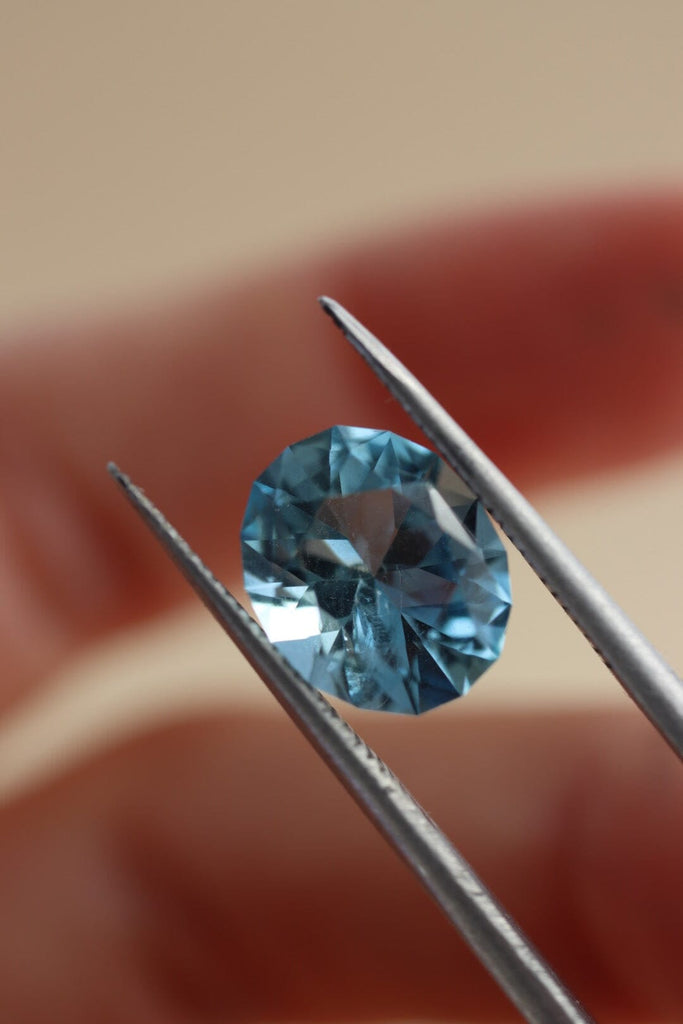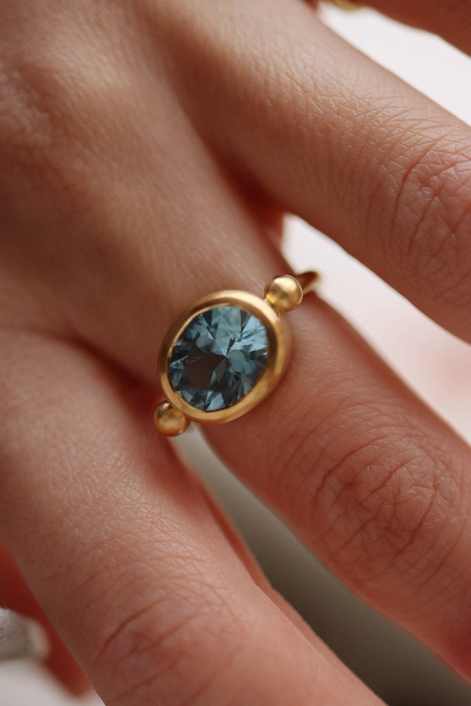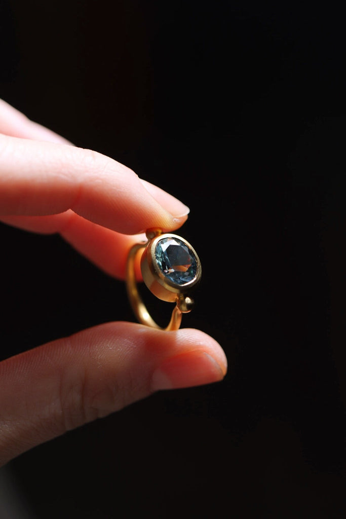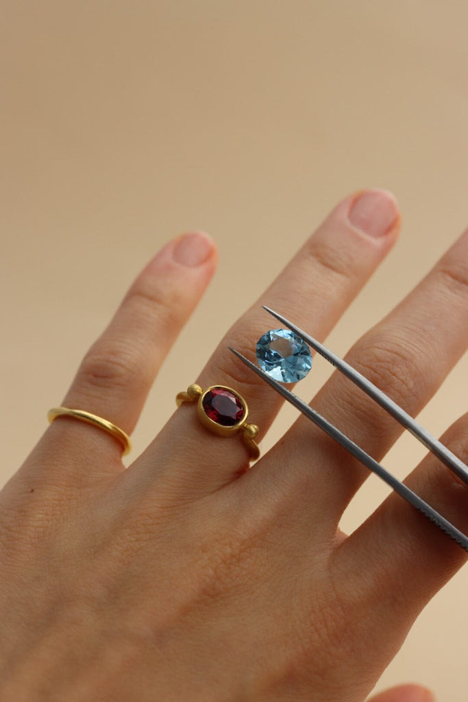 Questo esemplare, alla fine realizzato nella taglia 13, racchiude un'acquamarina estratta e tagliata in Kenya attraverso il progetto Virtu Gem di 10,8 x 8,8 mm (video della gemma).