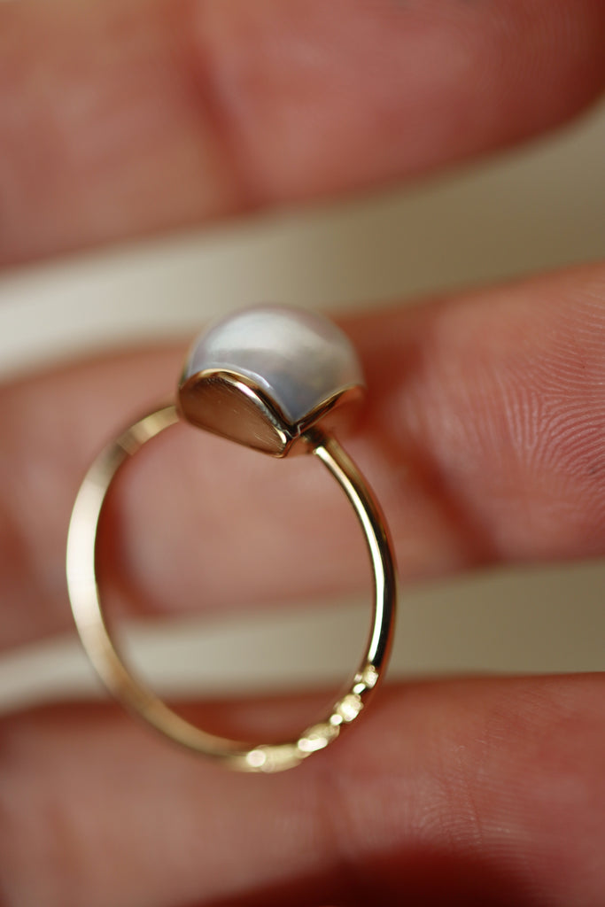 Nel progettare e realizzare un'idea ardita, mi sono spinta un po' lontano nell'alterare alcune perle barocche South Sea. L'idea di averle rovinate mi ha tormentata per mesi, finché non ho pensato di andare ancora più lontano, conferire loro delle facce come delle pietre e coprirle l'oro. Sono solo quelle che appaiono in foto e questa.