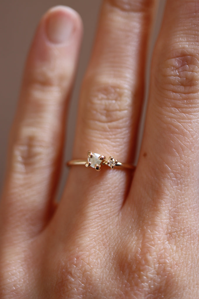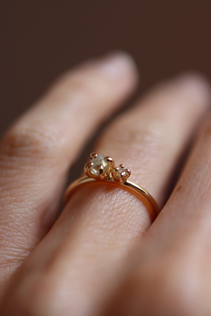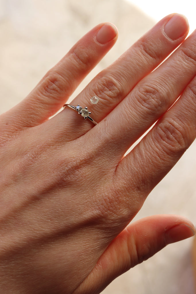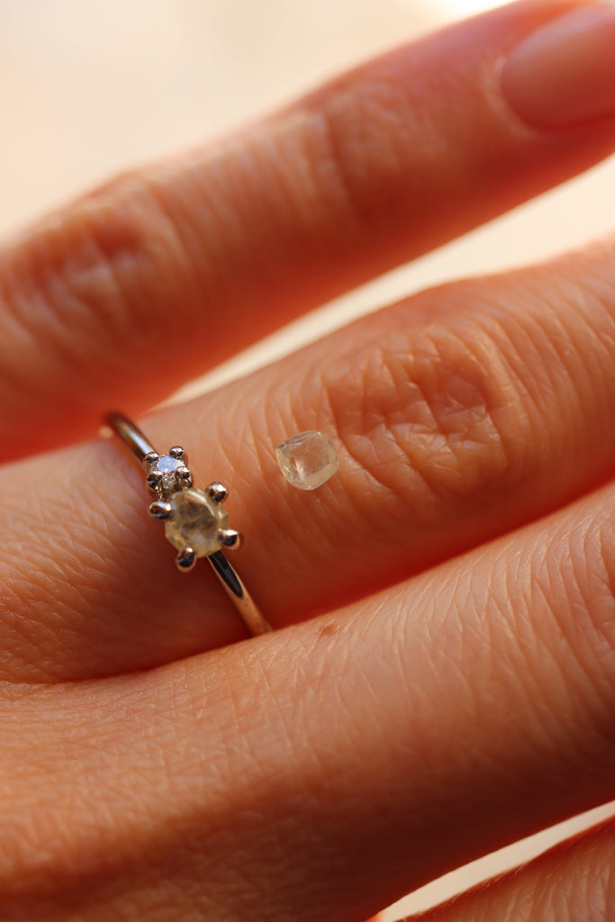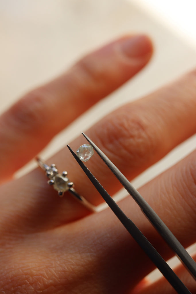 Due diamanti naturali dalla filiera Ocean Diamonds, uno tagliato e uno non tagliato, a esprimere la tensione che conferisce senso alla vita.