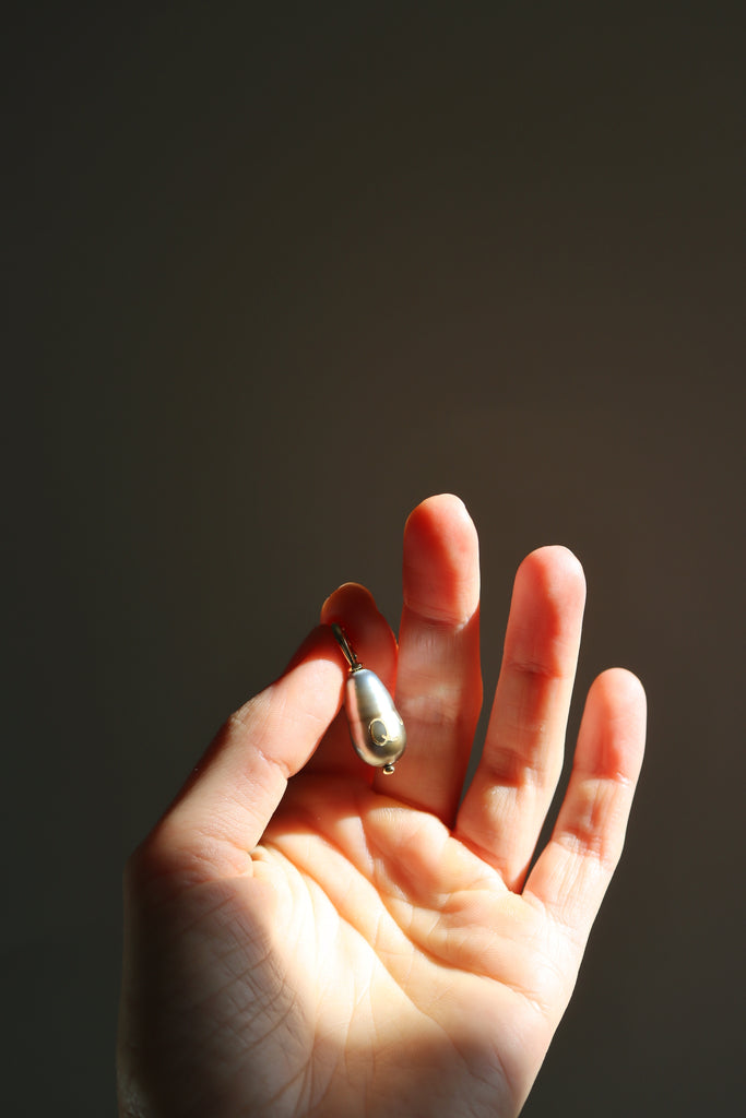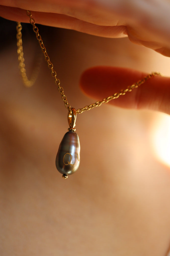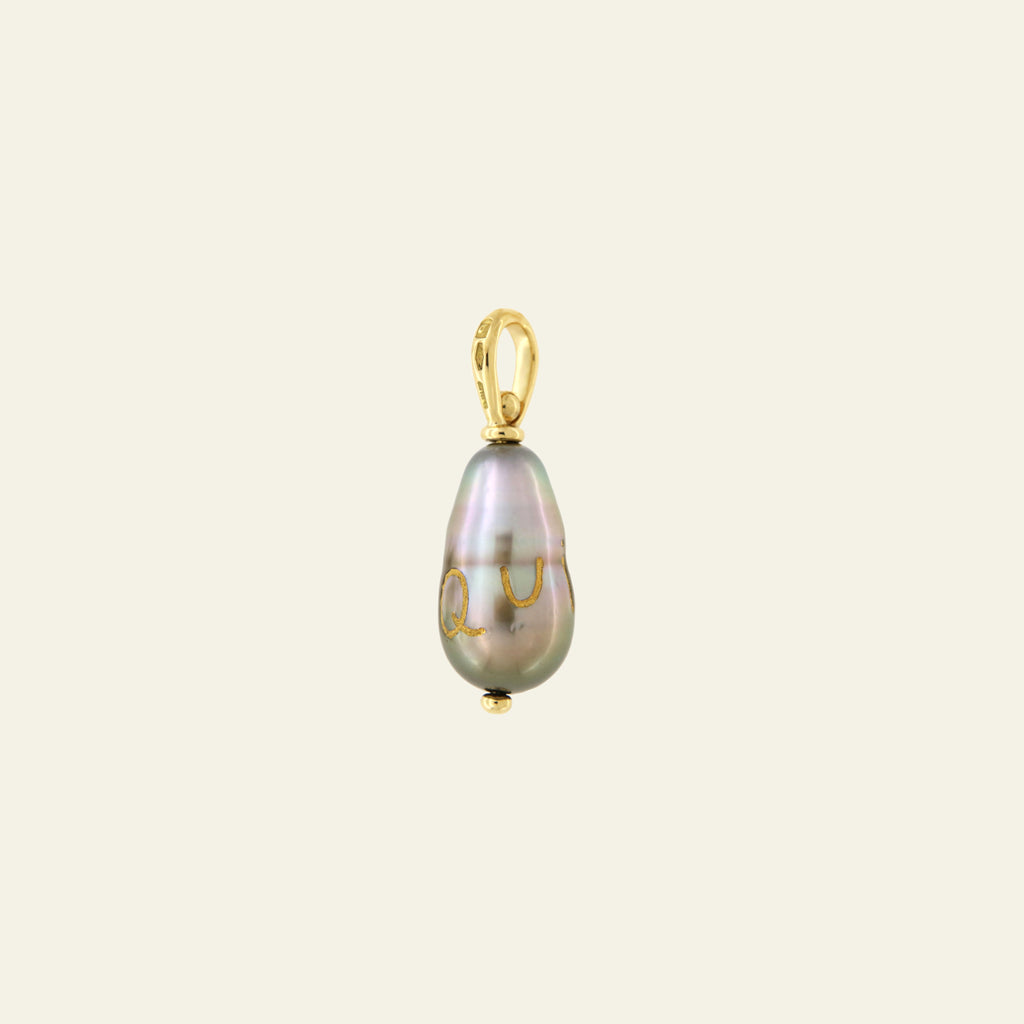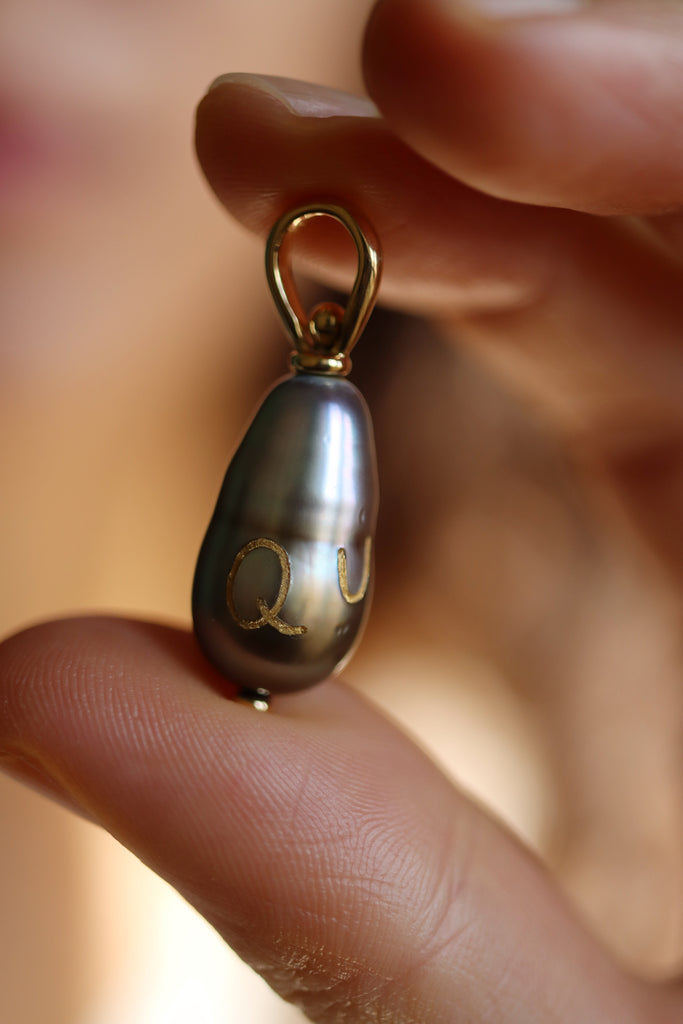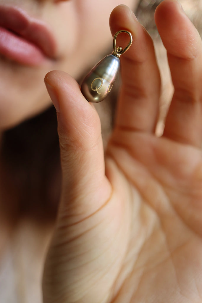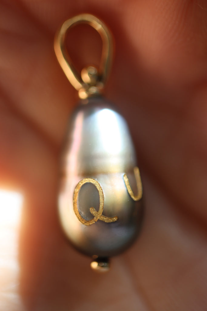 Una perla barocca di Tahiti da coltura sostenibile che misura circa 10,8 mm sulla pancia e le lettere " Q u i ", questa volta non lucide.