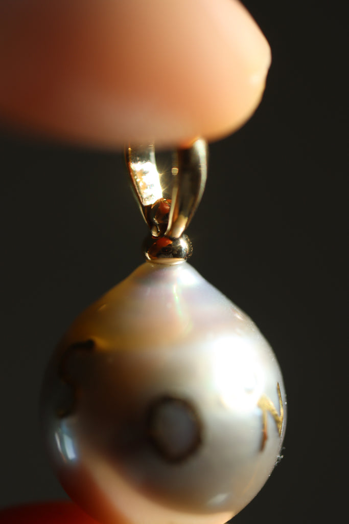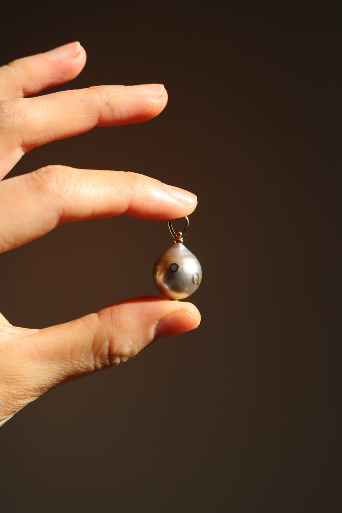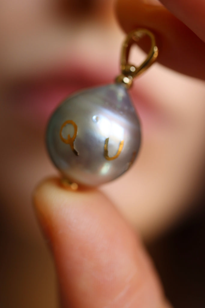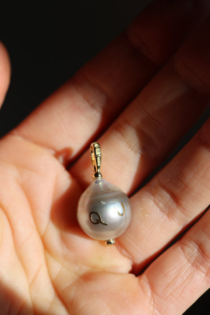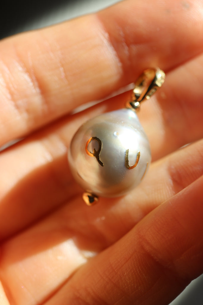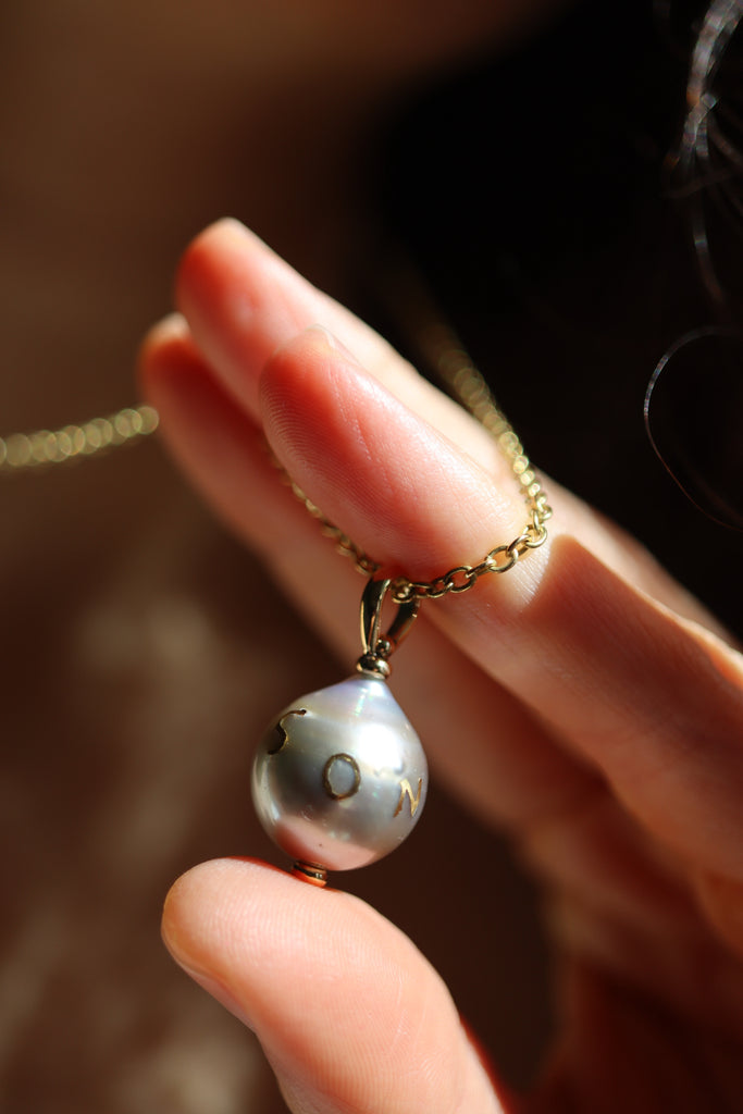 Una perla barocca di Tahiti da coltura sostenibile che misura circa 15 mm sulla pancia e le lettere: " S O N O Q U I ".