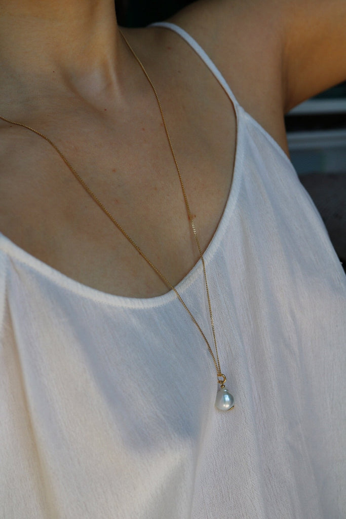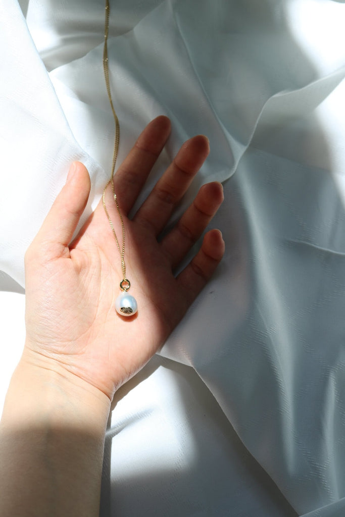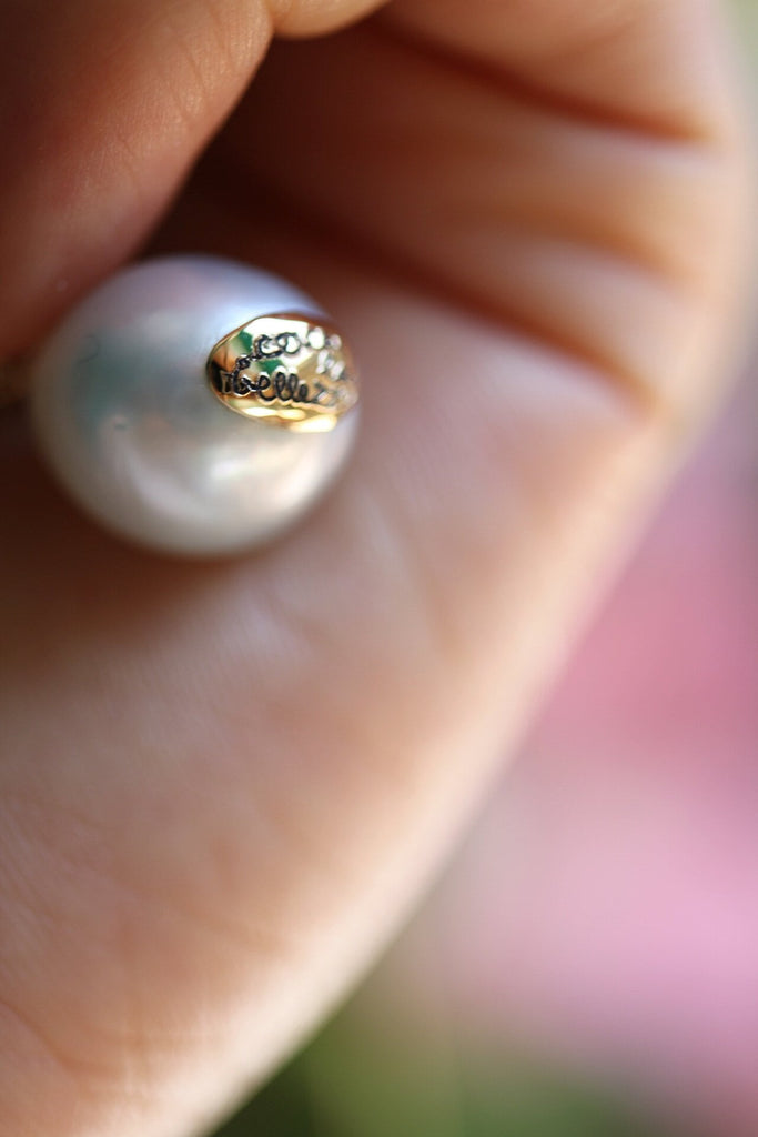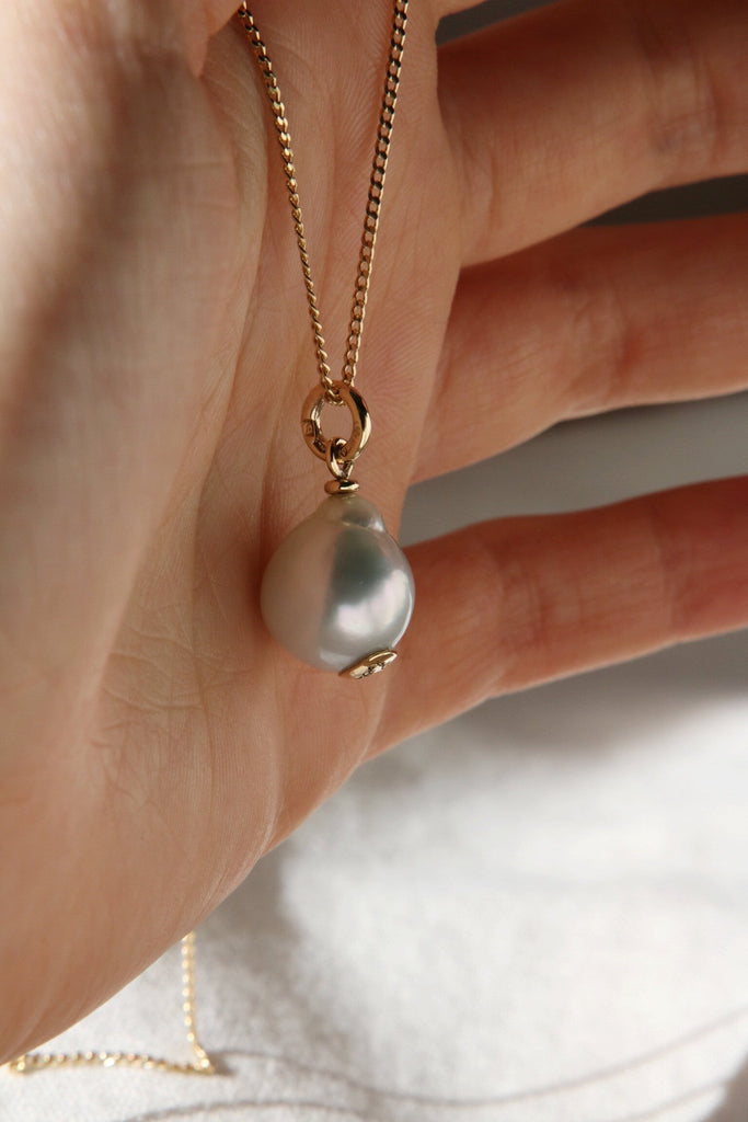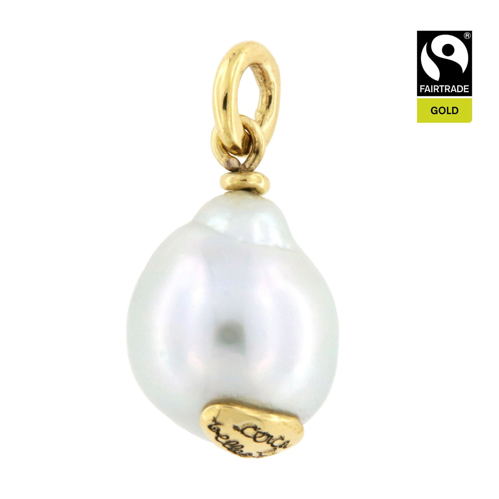 Ciondolo realizzato con Oro Certificato Fairtrade 18kt inciso a mano e perla sostenibile Marc'Harit del tipo South Sea (15x13mm circa).