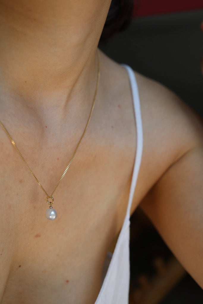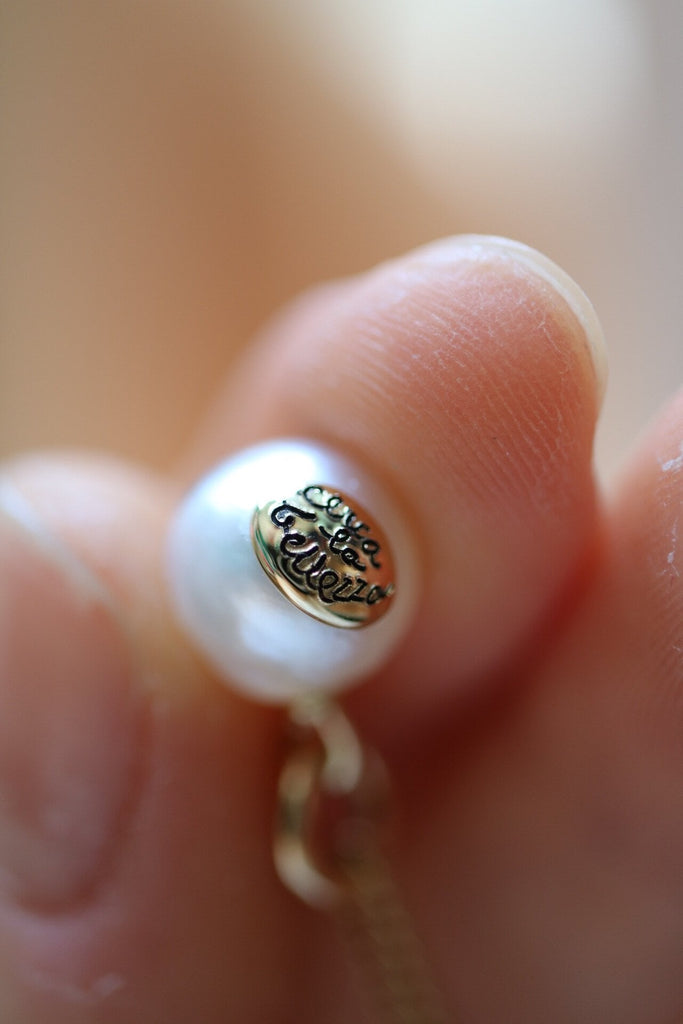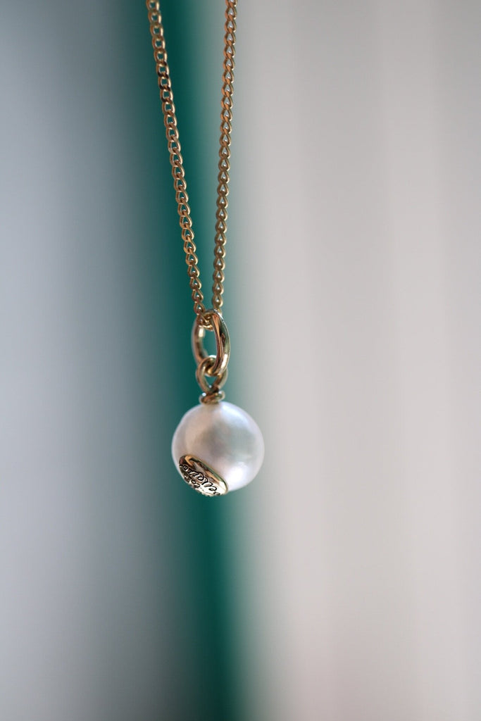 Ciondolo realizzato con Oro Certificato Fairtrade 18kt inciso a mano e perla sostenibile Marc'Harit del tipo South Sea (9-9,5mm).