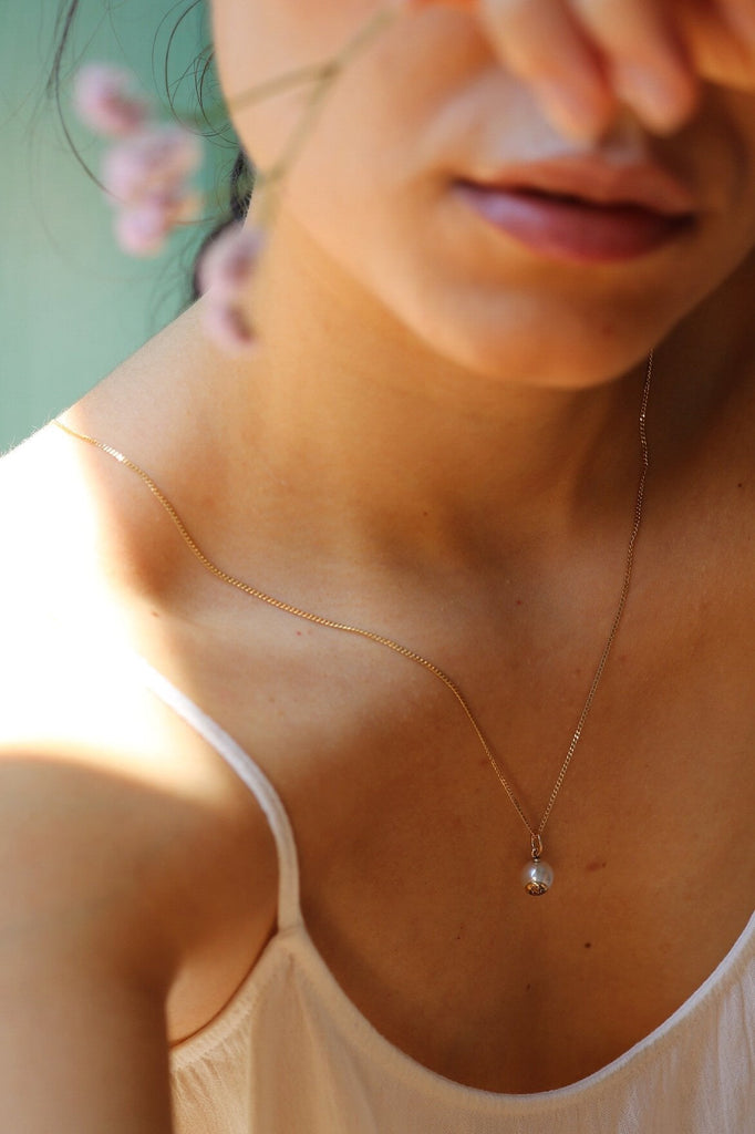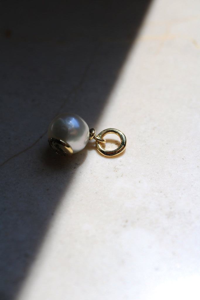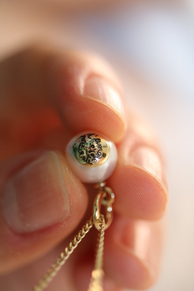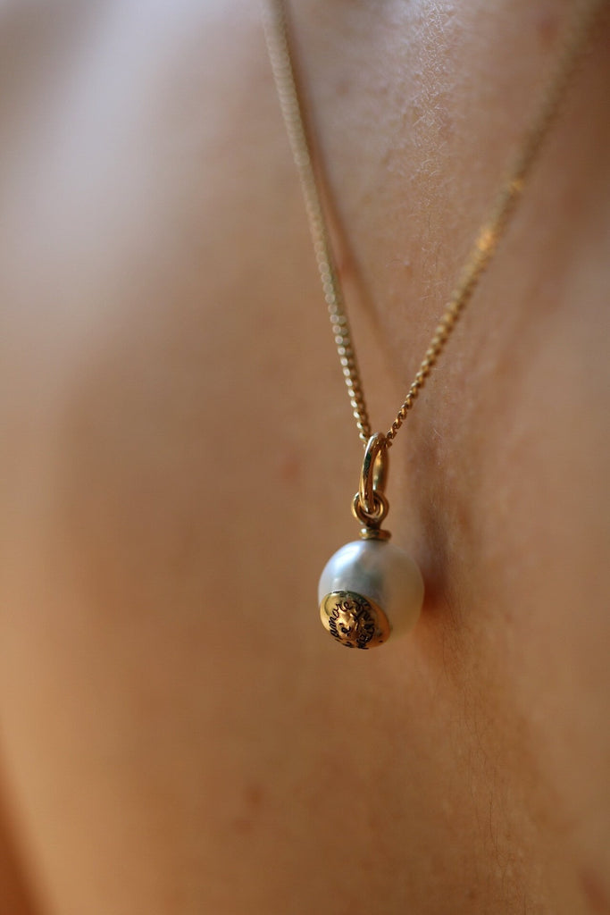 Ciondolo realizzato con Oro Certificato Fairtrade 18kt inciso a mano e perla sostenibile Marc'Harit del tipo South Sea (9-9,5mm).