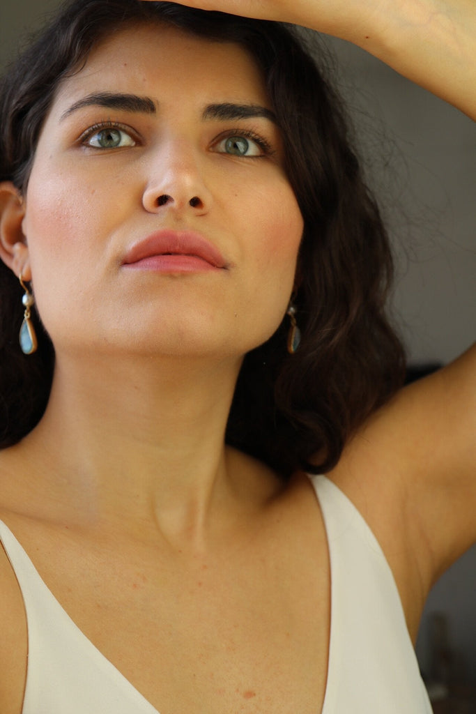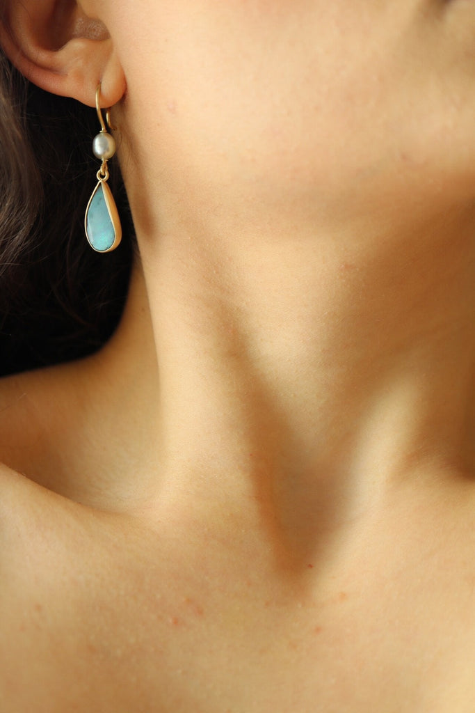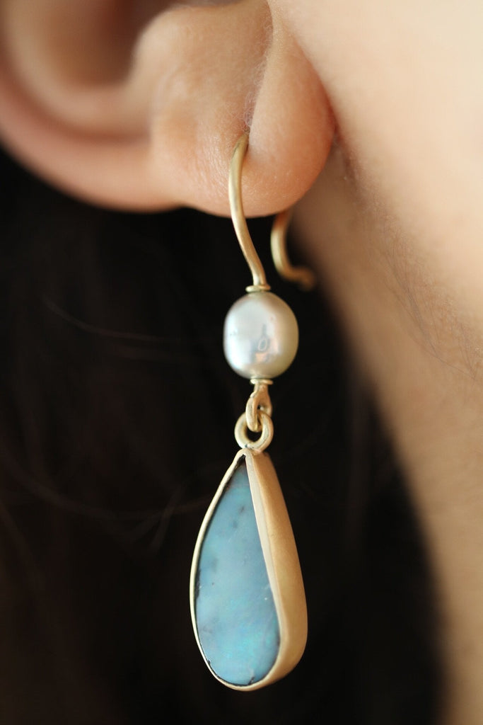 Oro Fairtrade 18kt di colore giallo caldo con finitura non lucida, perle keshi di Tahiti da coltura sostenibile e opali boulder del Central Queensland.
