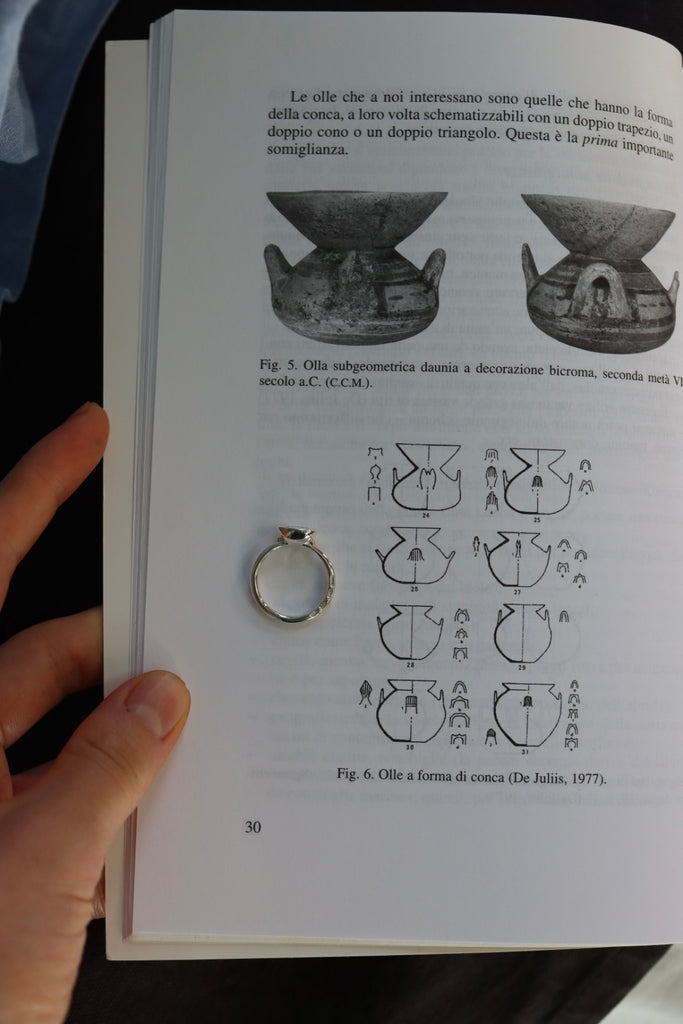 Porta questo nome perché quando l'ho finito ed osservato di lato - linee pulite, nascosti decori in oro Fairtrade 18k e un'incisione a decorarne la bocca - l'ho riconosciuto simile ai vasi degli antichi dauni.