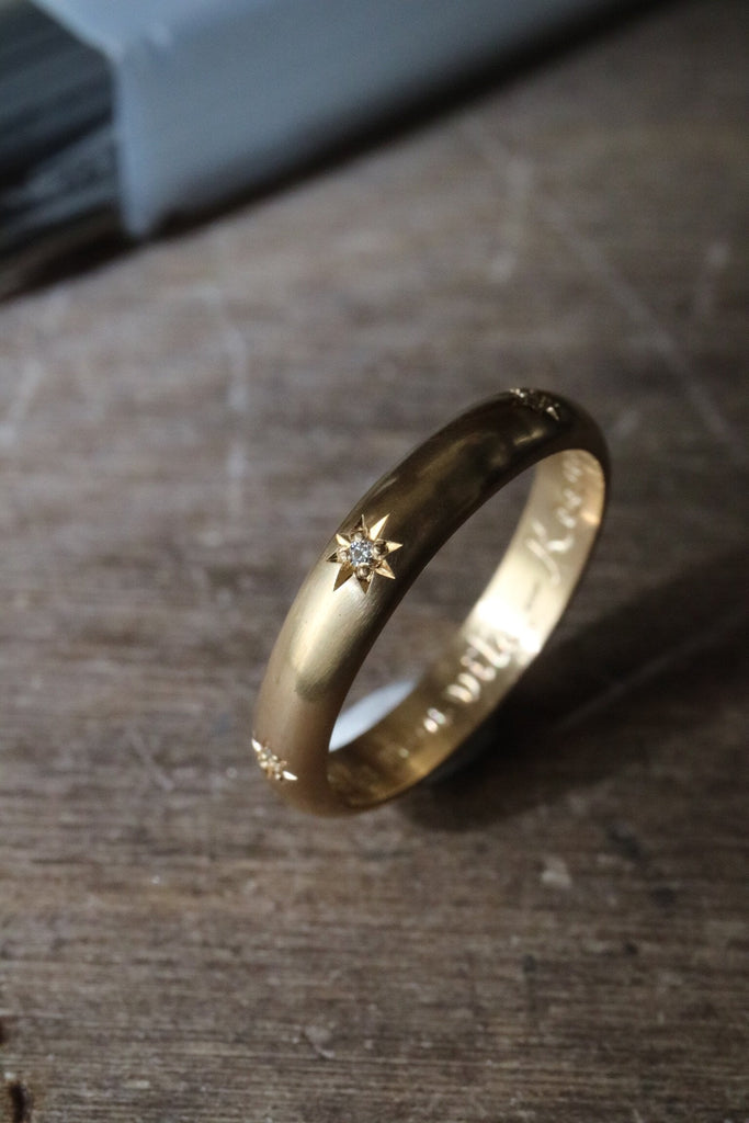 Anche se potrebbe sembrare, Nottetempo non ha le dimensioni e nemmeno le proporzioni dei Poesy: è bombato quel tanto che basta a far protendere le stelle verso il cielo. La finitura che ha appartiene a lui solo, perché non è lucida e nemmeno opaca: si tratta della lucidatura a mano, quella che si ottiene senza l'ausilio di strumenti elettrici. Questa scelta viene dal desiderio di far lampare di luce le incisioni nell'oro che creano stelle di diamanti.