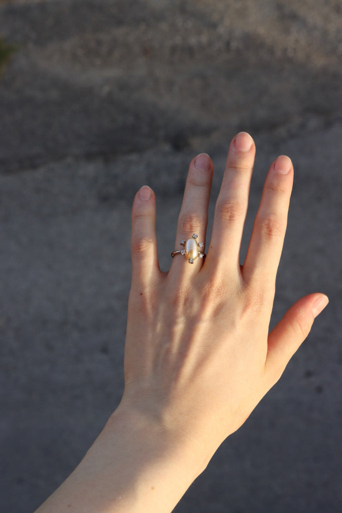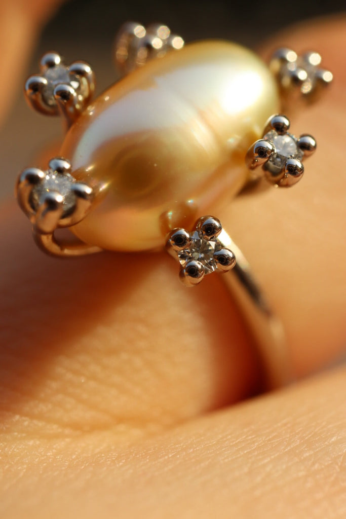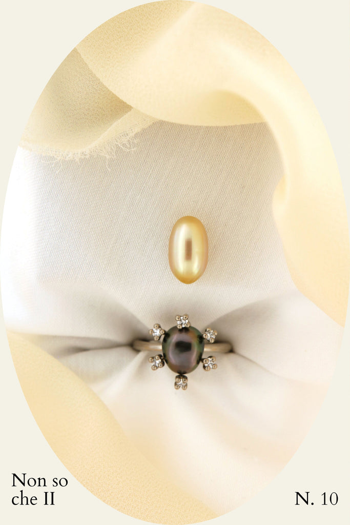 L'anello Non so che II è una perla che fluttua su un filo d'oro, sorretta da diamanti che sembrano crescerle attorno. Nascosta, sotto la perla, a contatto con la pelle, un motto: "non so che".