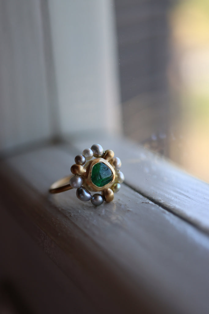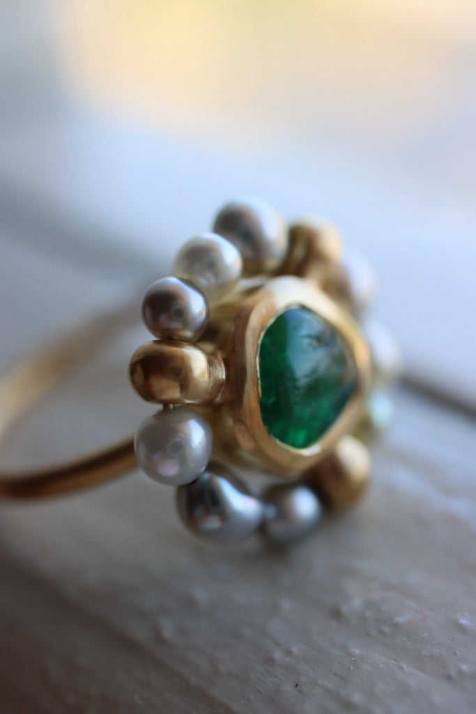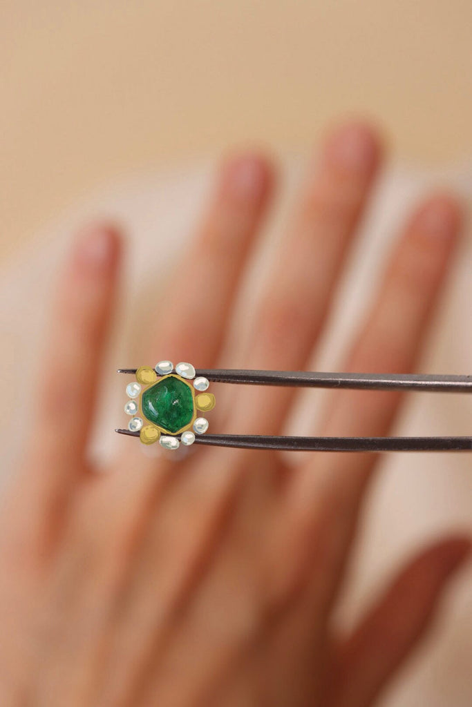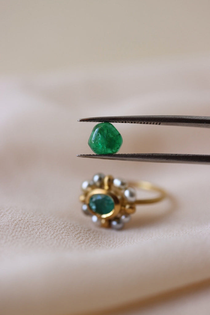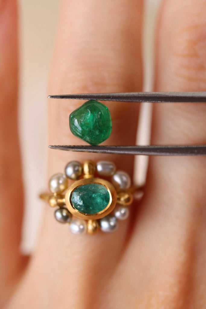 Questo esemplare custodisce uno smeraldo estratto e tagliato responsabilmente in Zambia all'interno del progetto Virtu Gem, che misura 6,75 x 6,51 mm. Si tratta di una gemma dal taglio inusuale, rispetto a quelle utilizzate negli esemplari precedenti, ma non riesco a immagine questa pietra utilizzata per nessun altro gioiello. Tra le foto ve n'è una sulla quale ho disegnato la possibile riuscita di questo esemplare. Il video della gemma appare tra le foto.