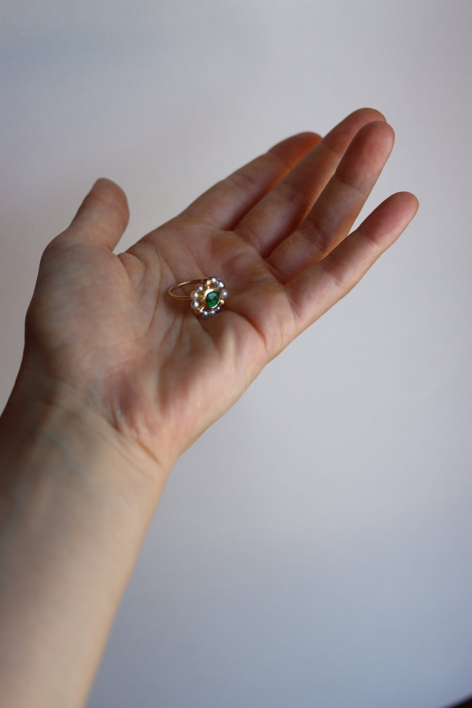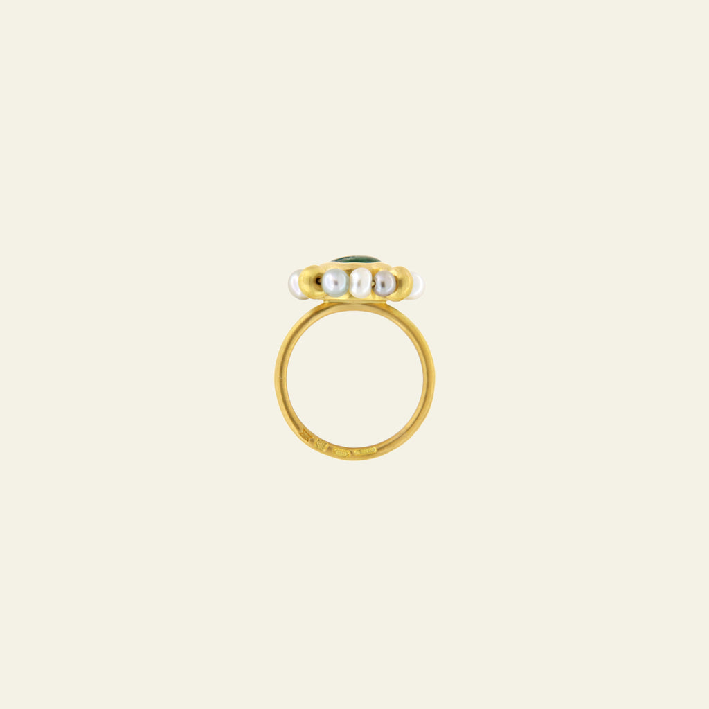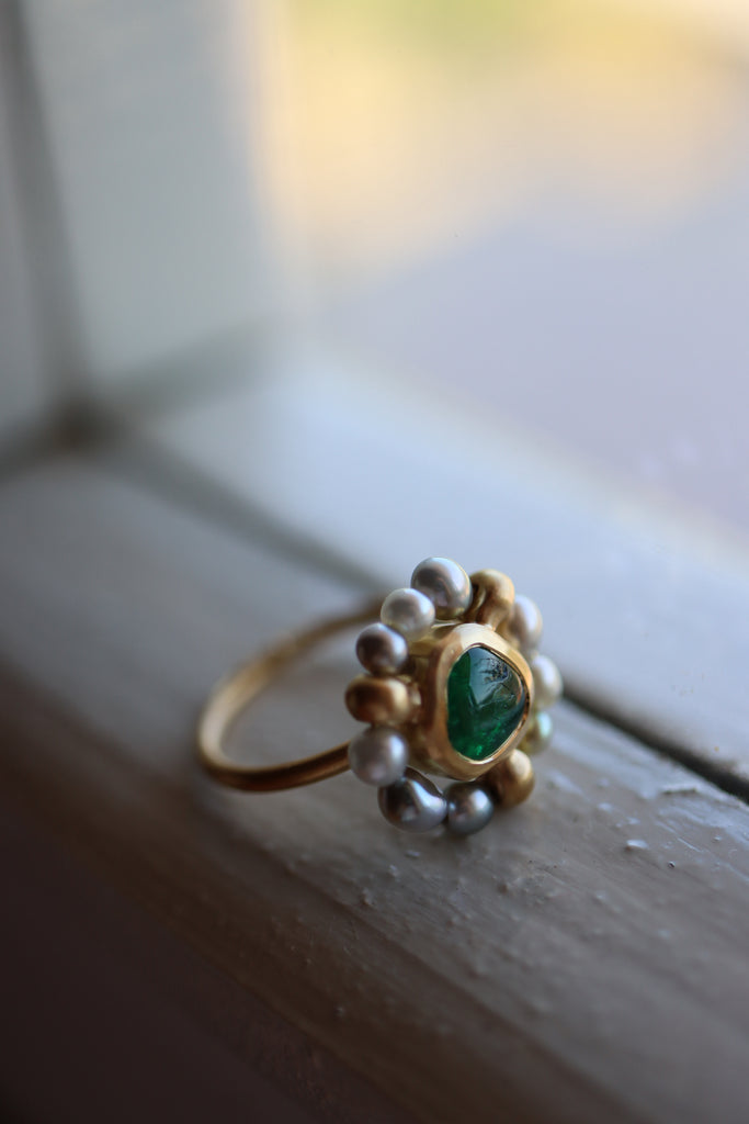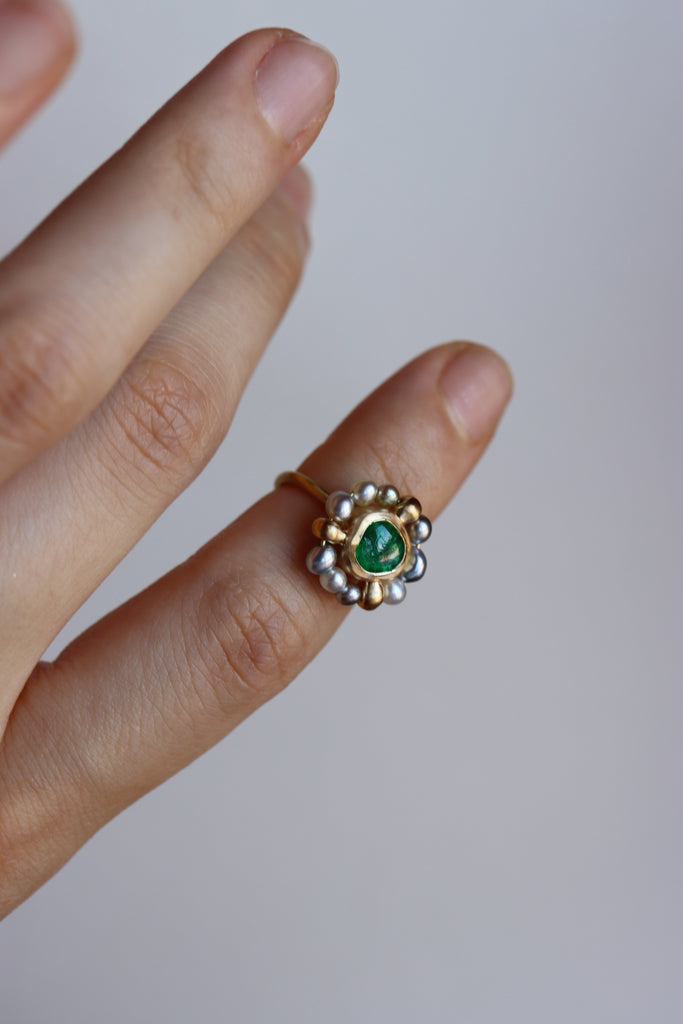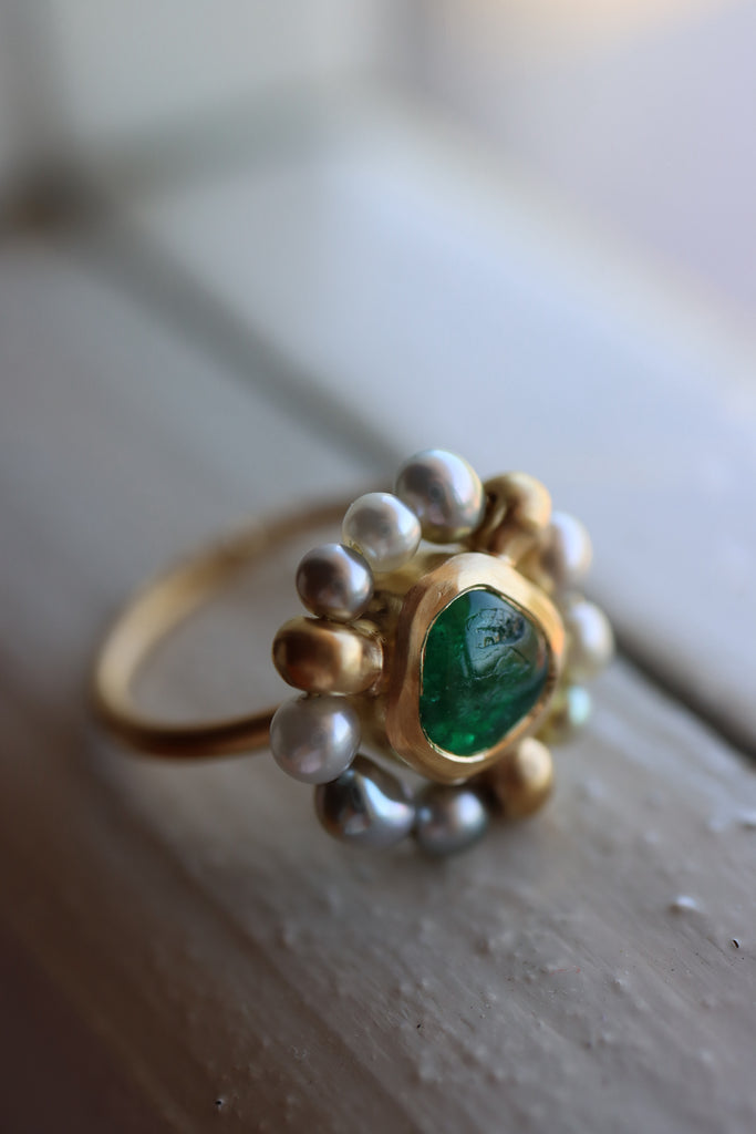 Questo esemplare custodisce uno smeraldo estratto e tagliato responsabilmente in Zambia all'interno del progetto Virtu Gem, che misura 6,75 x 6,51 mm. Si tratta di una gemma dal taglio inusuale, rispetto a quelle utilizzate negli esemplari precedenti, ma non riesco a immagine questa pietra utilizzata per nessun altro gioiello. Tra le foto ve n'è una sulla quale ho disegnato la possibile riuscita di questo esemplare. Il video della gemma appare tra le foto.