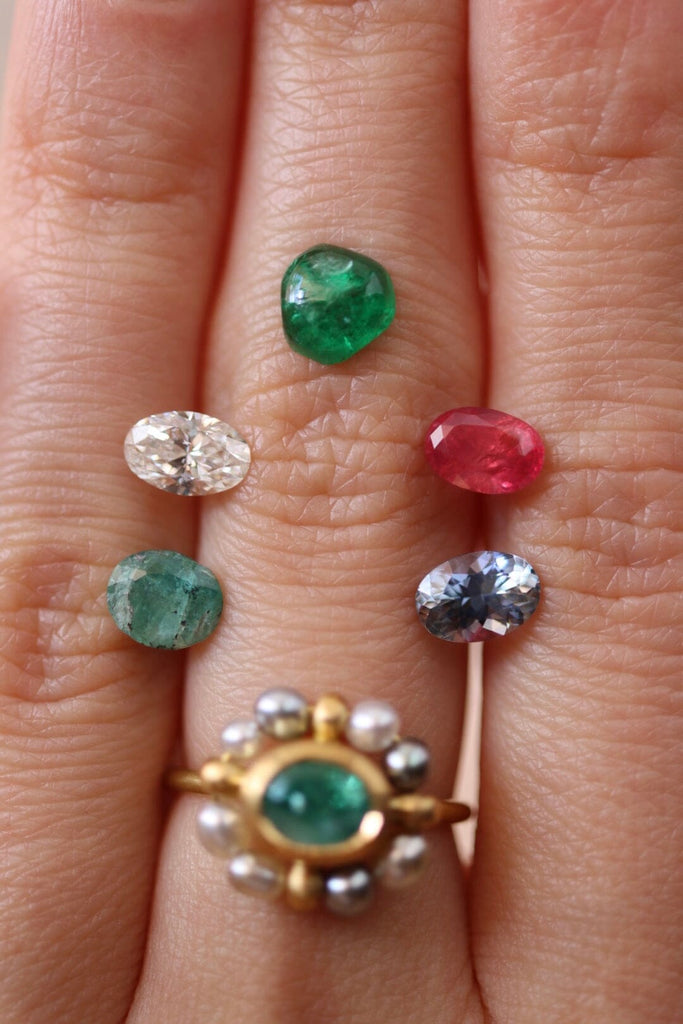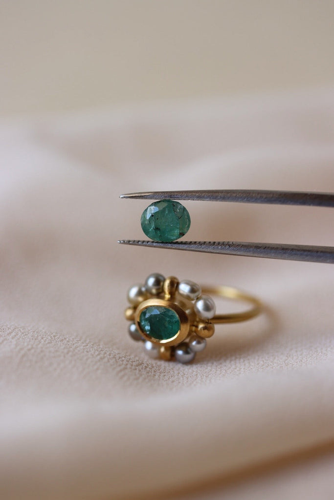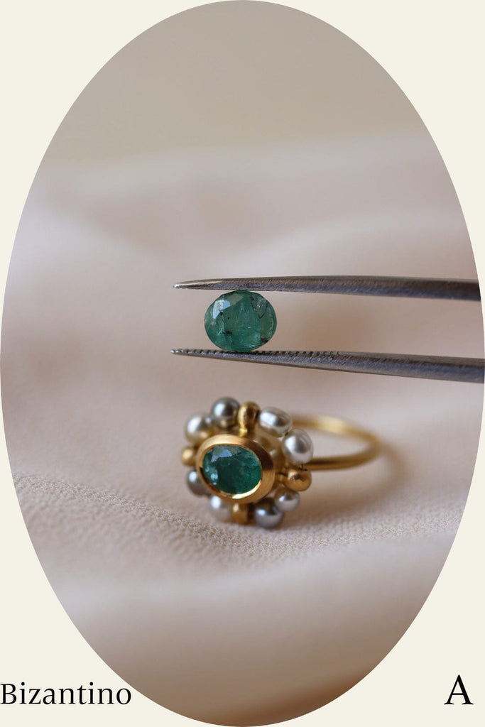 Questo esemplare avrebbe dovuto custodire uno smeraldo estratto e tagliato responsabilmente in Zambia, all'interno del progetto Virtu Gem, di 5,67 x 6,75 mm. Ahimè ho commesso un errore nell'incastonatura, perciò è stato necessario sostituire la gemma.