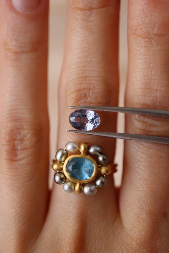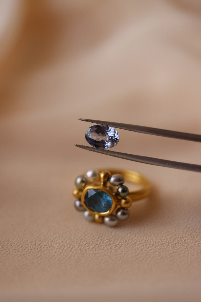 Questo esemplare, alla fine realizzato nella taglia 16 italiana, custodisce uno zaffiro estratto e tagliato responsabilmente in Sri Lanka di 5,80 x 8,58 mm.