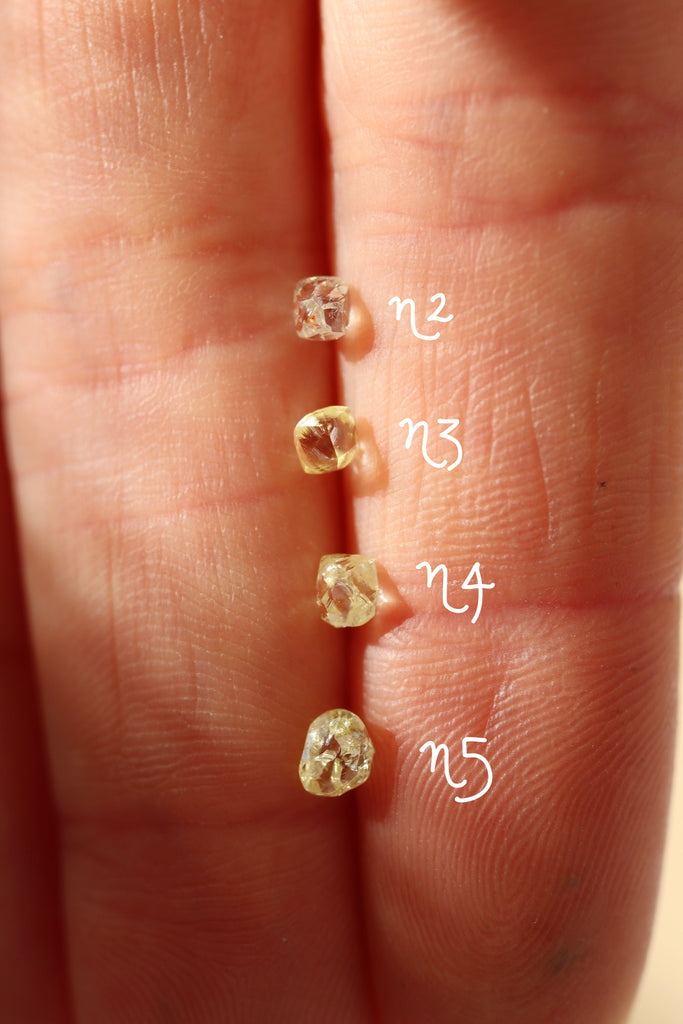 Un filo d'oro e un diamante naturale non tagliato dalla filiera Ocean Diamonds di 0,215 ct e circa 2,96 x 3,24 x 2,73 mm.