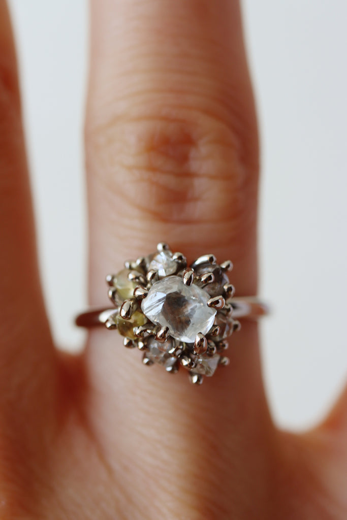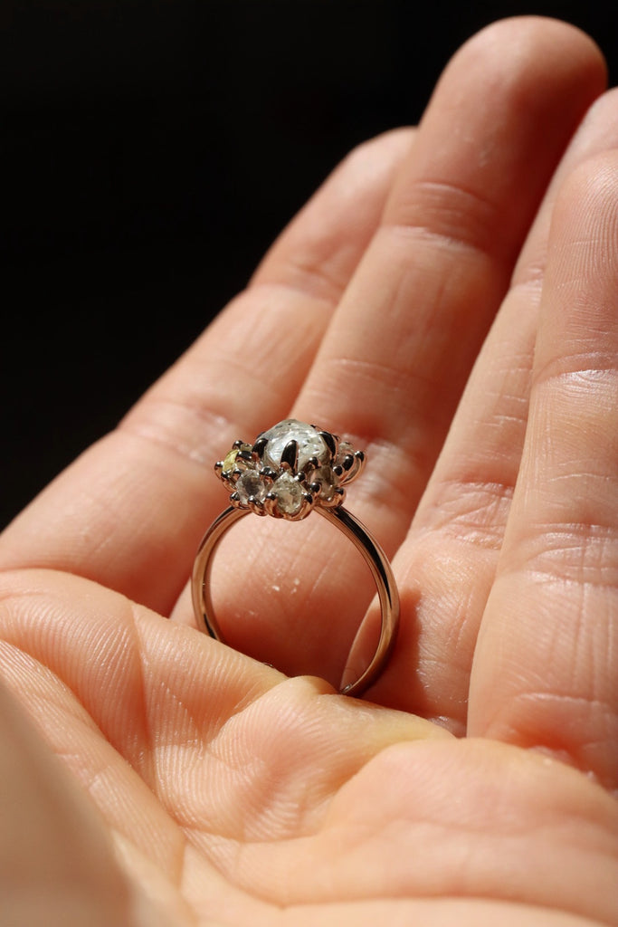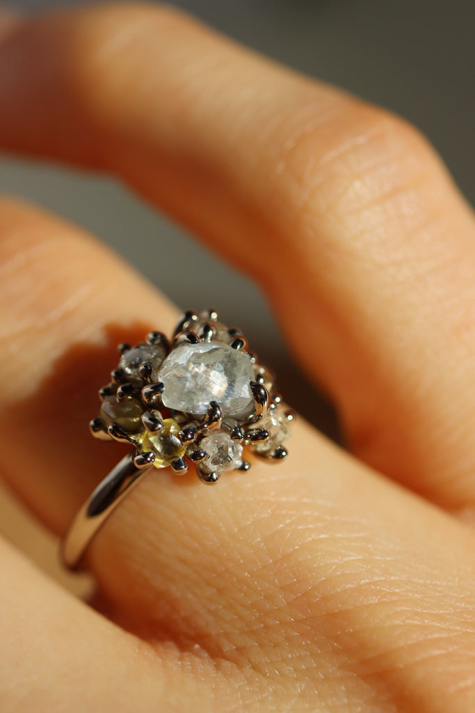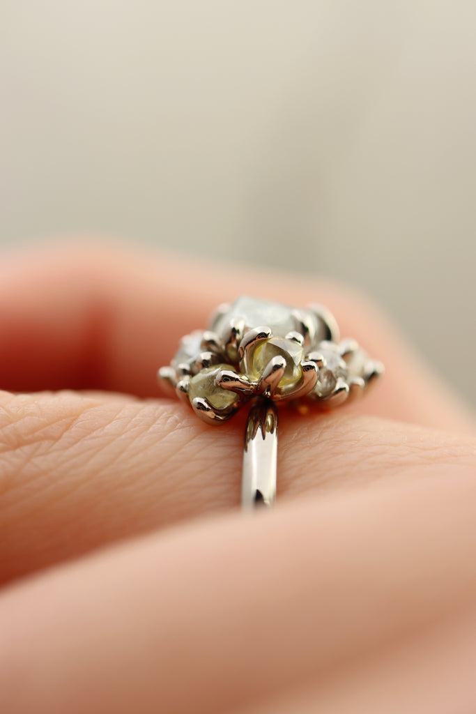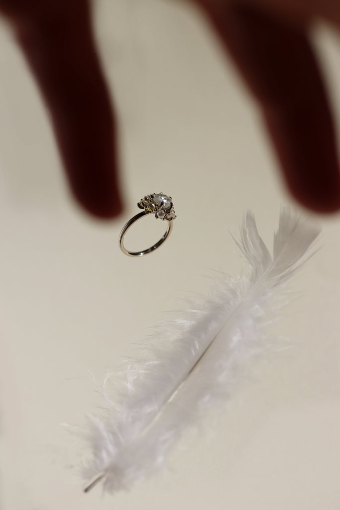 Questo esemplare è stato realizzato nella taglia 13 italiana (53 del misuratore), ma sarà possibile crearne degli altri, coincidenti nell'essenza ma diversi e unici, a riflettere la forma dei diamanti scelti. Scrivimi.