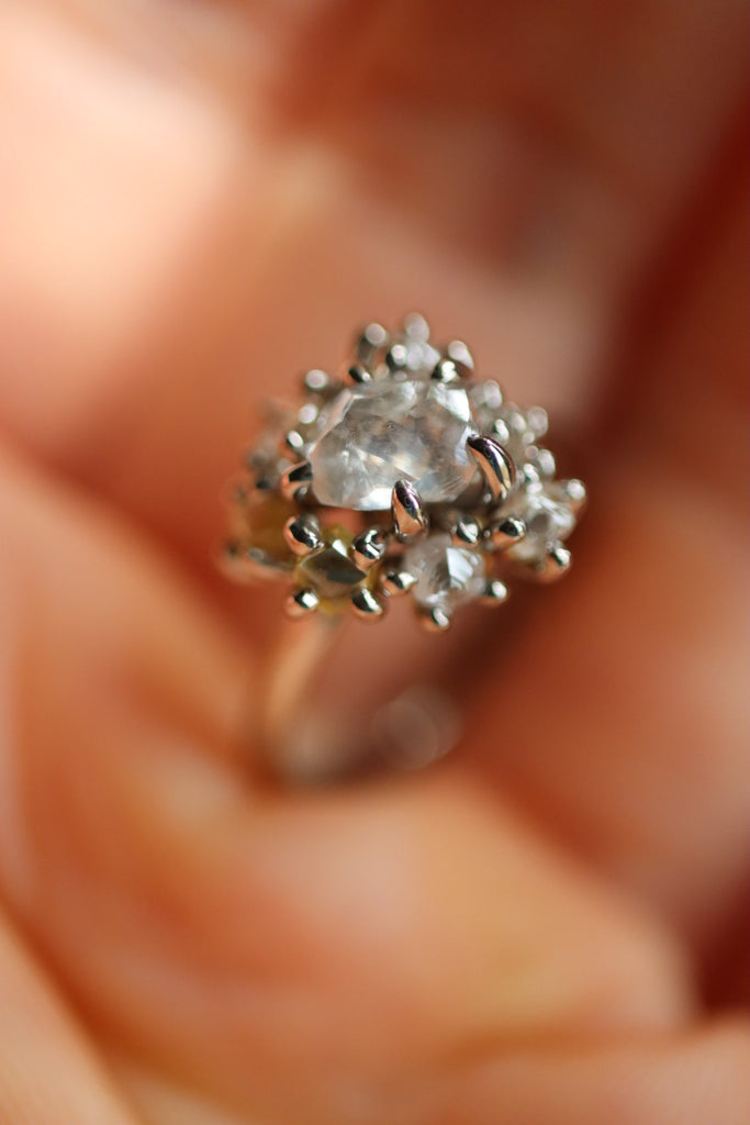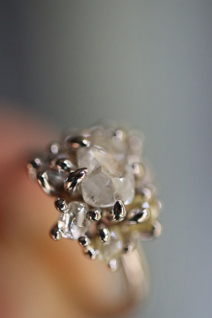Una profusione di diamanti naturali non tagliati, che cercano di stringersi forte forte per tornare a essere uno, e un paio di diamanti naturali tagliati, nascosti alla vista, d'oro giallo vivo adornati, e a contatto con la pelle.