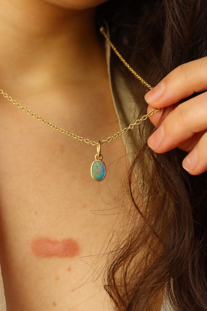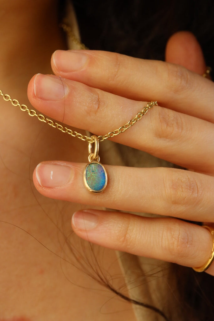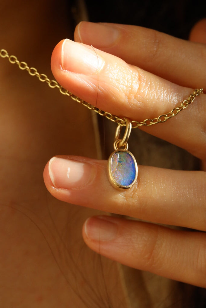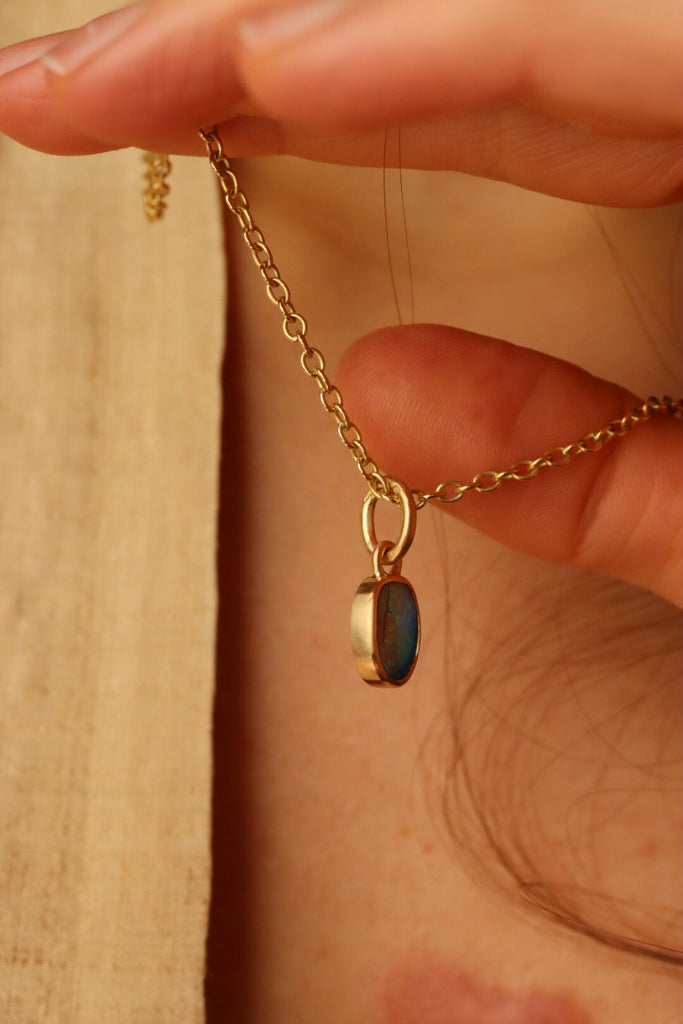 Un ciondolo in oro certificato Fairtrade 18k con protagonista un opale boulder del Central Queensland di 10,1 x 7,1 mm.