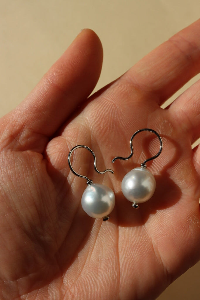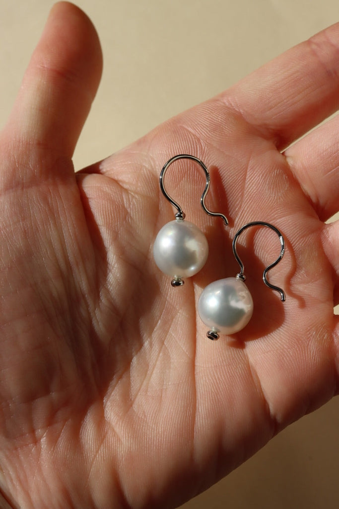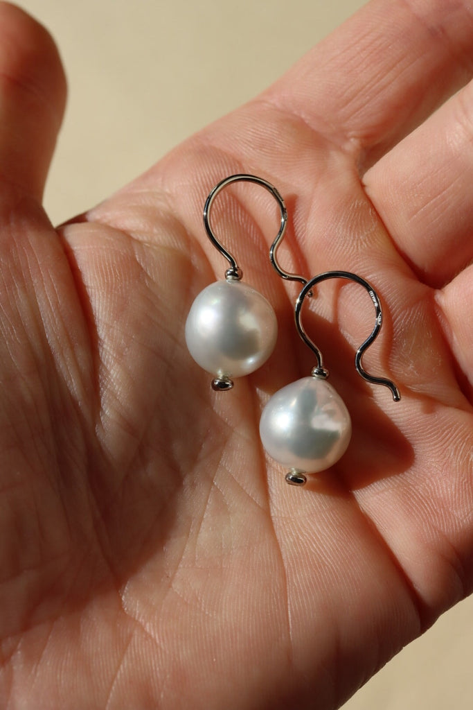 Una coppia di perle barocche South Sea da coltura sostenibile che misurano circa 12-13 mm sulla pancia, cioè in larghezza.