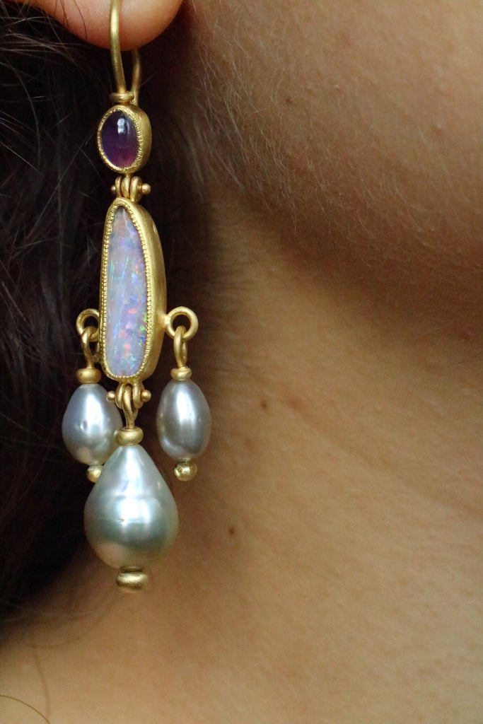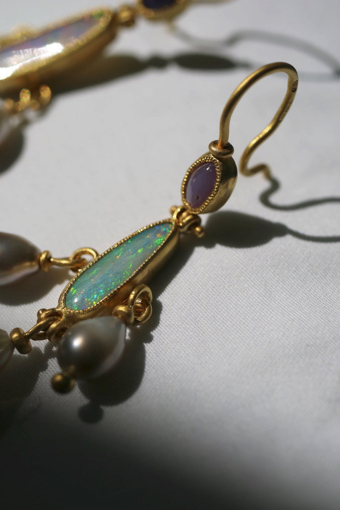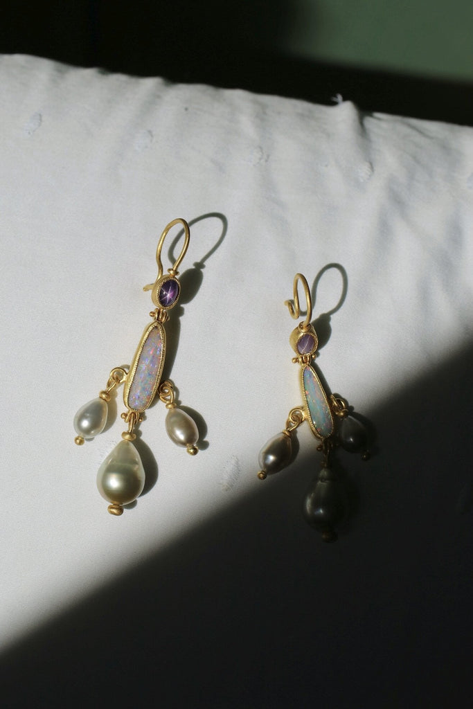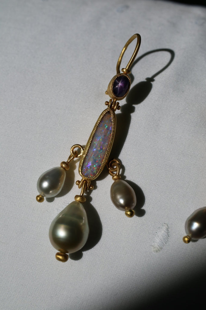 Oro certificato Fairtrade 22k (916), rubini stella tagliati ed estratti in Sri Lanka, opali estratti e tagliati nel Central Queensland (Australia), perle Keshi di Tahiti Marc'Harit e perle barocche delle Fiji Marc'Harit (circa 10,5 mm sulla pancia).
